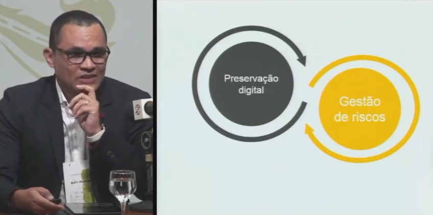 Alex também sublinhou que a gestão dos riscos em preservação digital vai além de questões de infraestrutura tecnológica, perpassando diversas normas da área que tratam, por exemplo, de direitos autorais, governança e processos internos do funcionamento de um repositório de documentos digitais, que podem não ser relacionados ao uso de tecnologia. Ele citou, entre essas normas, a Resolução nº 39, de 29 de abril de 2014 , e a Resolução nº 43, de 4 de setembro de 2015 , ambas do Conarq. “Essas normas nada mais são que uma tentativa de estabelecer um framework e um checklist que buscam avaliar os riscos, porque essas normas são, em si, definidoras dos fatores de risco no contexto de um repositório e da preservação digital”, explicou.