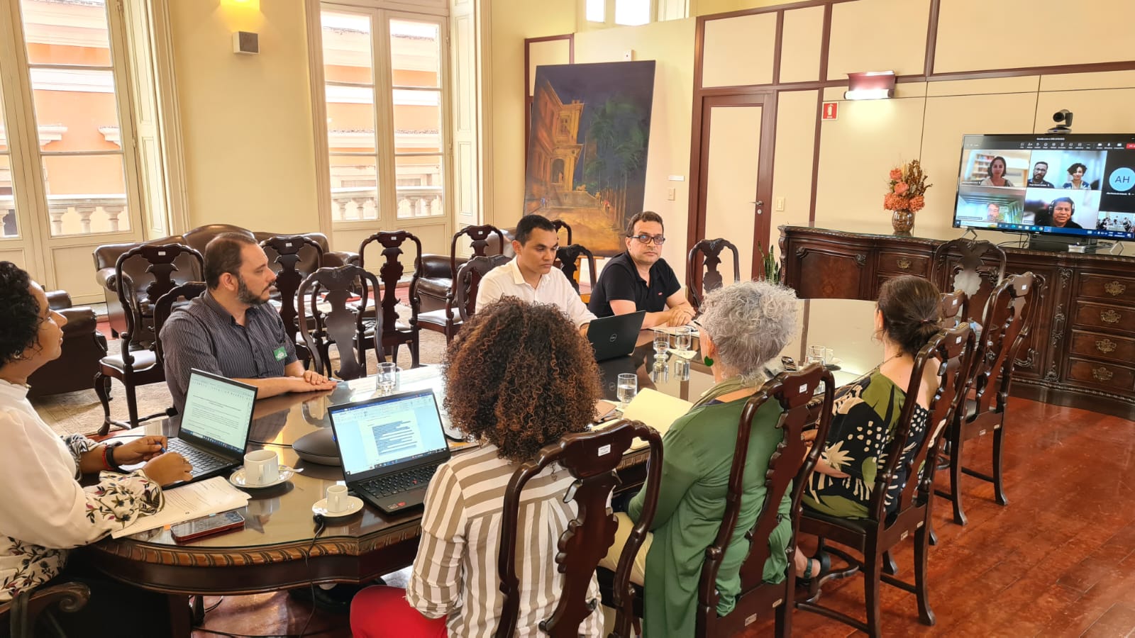 A reunião contou ainda com a participação de Monica Lima, coordenadora-geral de Articulação de Projetos e Internacionalização do AN; Eliel Benites, d iretor do Departamento de Línguas e Memória do Ministério dos Povos Indígenas (MPI) ; Layla Carvalho, assessora da Secretaria das Políticas de Ação Afirmativa e Combate e Superação ao Racismo do Ministério da Igualdade Racial , representando a secretária Marcia Lima; Izabel Cury, c oordenadora de projetos da Assessoria Especial de Assuntos Internacionais, e Leonardo de Oliveira Gonçalves, coordenador-geral Jurídico de Licitações e Contratos da Conjur, ambos do Gabinete do Ministério da Gestão e da Inovação em Serviços Públicos; Alex de Holanda, secretário-executivo do Conarq , Claudia Beatriz Heynemann , s upervisora do Projeto Coluso no Arquivo Nacional , Marcos Luiz Barreto Gomes, arquivista na secretaria-executiva do Conarq , e Marcos da Silva Matheus, responsável técnico pelo ACT na UERJ .