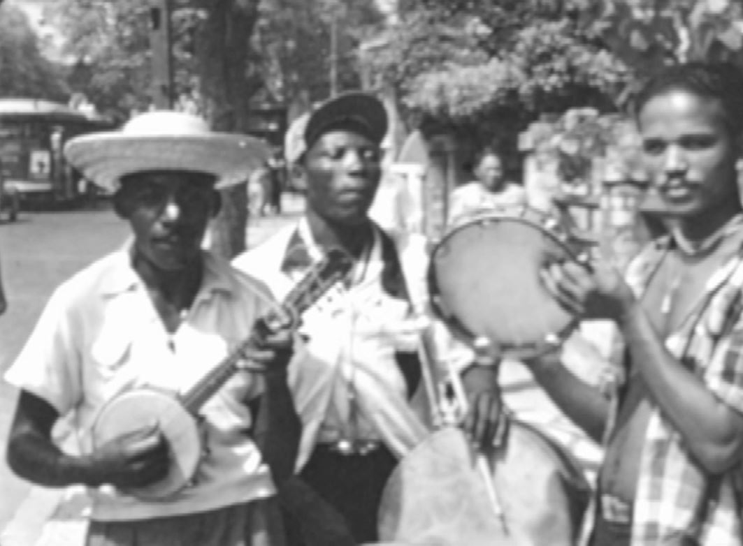 Registros históricos do carnaval nos anos 1940, com cenas de foliões de rua e de escolas de samba.