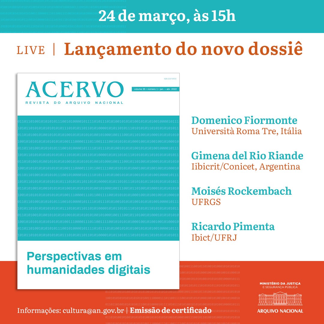 O Arquivo Nacional, lançará, em 24 de março (quinta-feira), às 15h, o dossiê “Perspectivas em humanidades digitais”, da revista Acervo. O lançamento virtual do dossiê contará com a participação de seus editores, Ricardo Pimenta, do Instituto Brasileiro de Informação em Ciência e Tecnologia (Ibict), e Moisés Rockembach, da Universidade Federal do Rio Grande do Sul (UFRGS); e dos autores Gimena del Rio Riande, pesquisadora do Instituto de Investigaciones Bibliográficas y Crítica Textual (Iibicrit/Conicet), da Argentina, e Domenico Fiormonte, professor da Università Roma Tre, Itália.