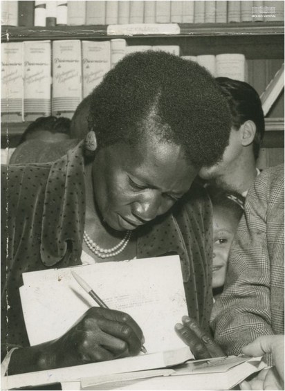 Na imagem, Carolina Maria de Jesus durante uma sessão de autógrafos no lançamento de “Quarto de Despejo” numa livraria de São Paulo, em 1960. Arquivo Nacional. Fundo Correio da Manhã. BR_RJANRIO_PH_0_FOT_26878_0001