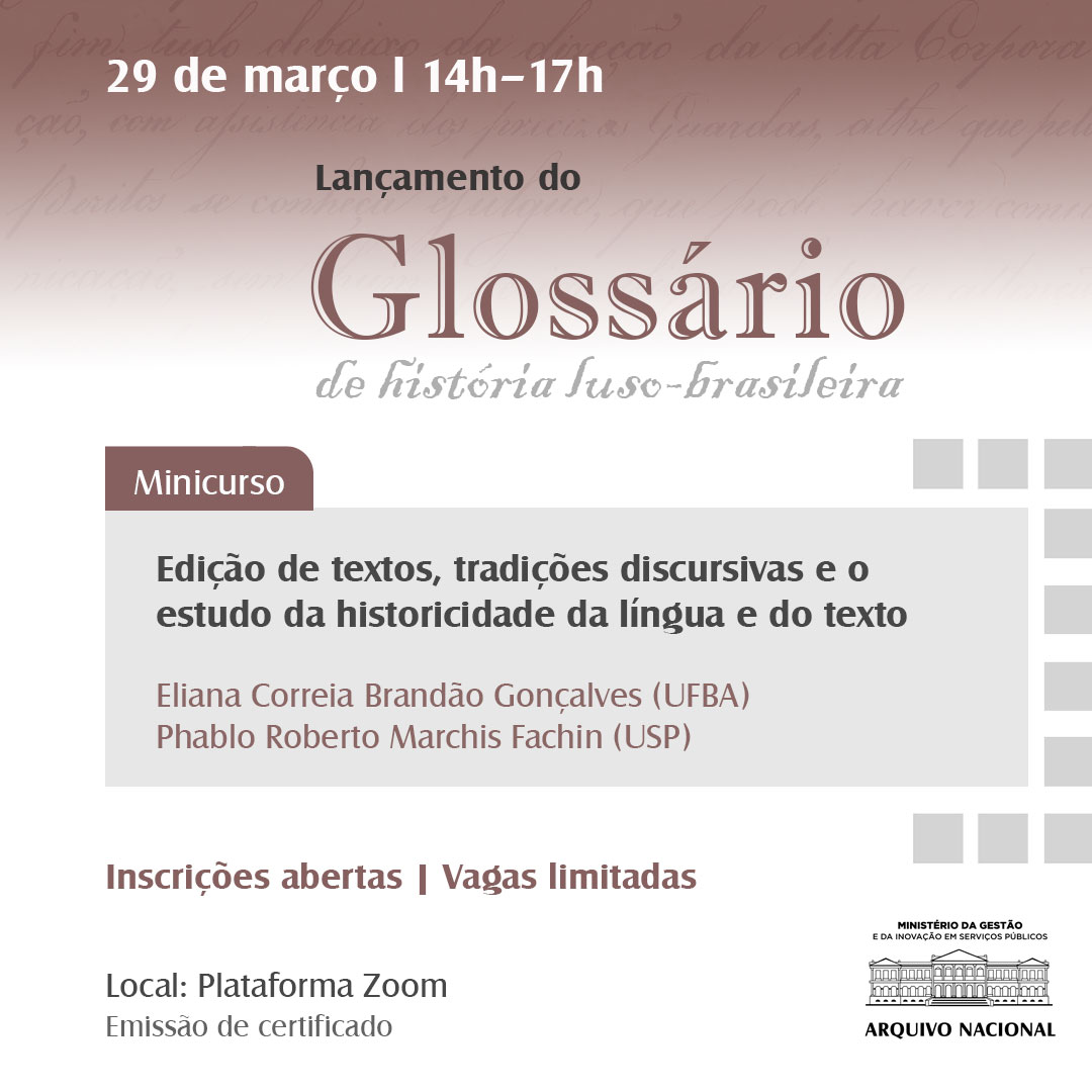 A atividade ocorrerá em 29 de março, das 14h às 17h, dentro da plataforma Zoom, e contará com emissão de certificados para os participantes. As vagas são limitadas. Confira a chamada para o minicurso Edição de textos, Tradições discursivas e o estudo da historicidade da língua e do texto . Para mais informações, envie uma mensagem para cultura@an.gov.br .