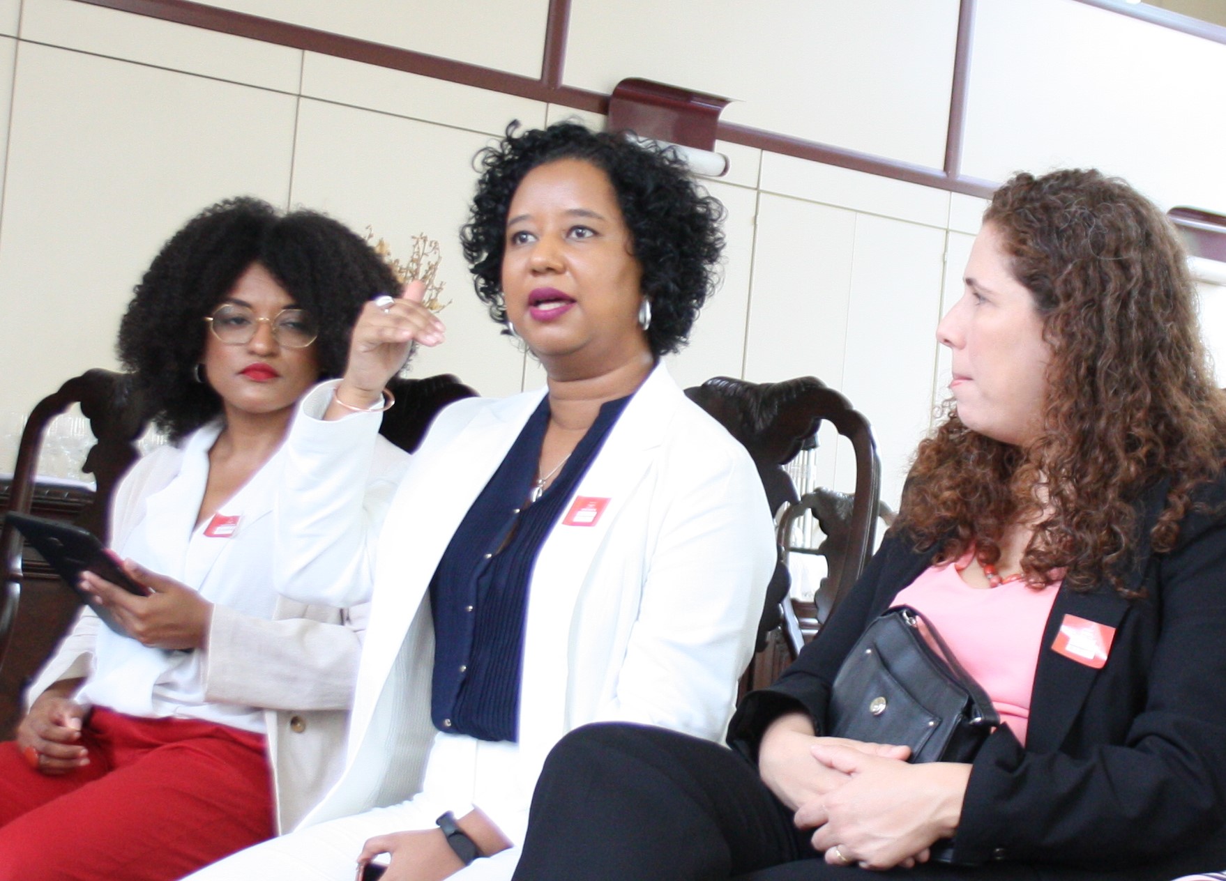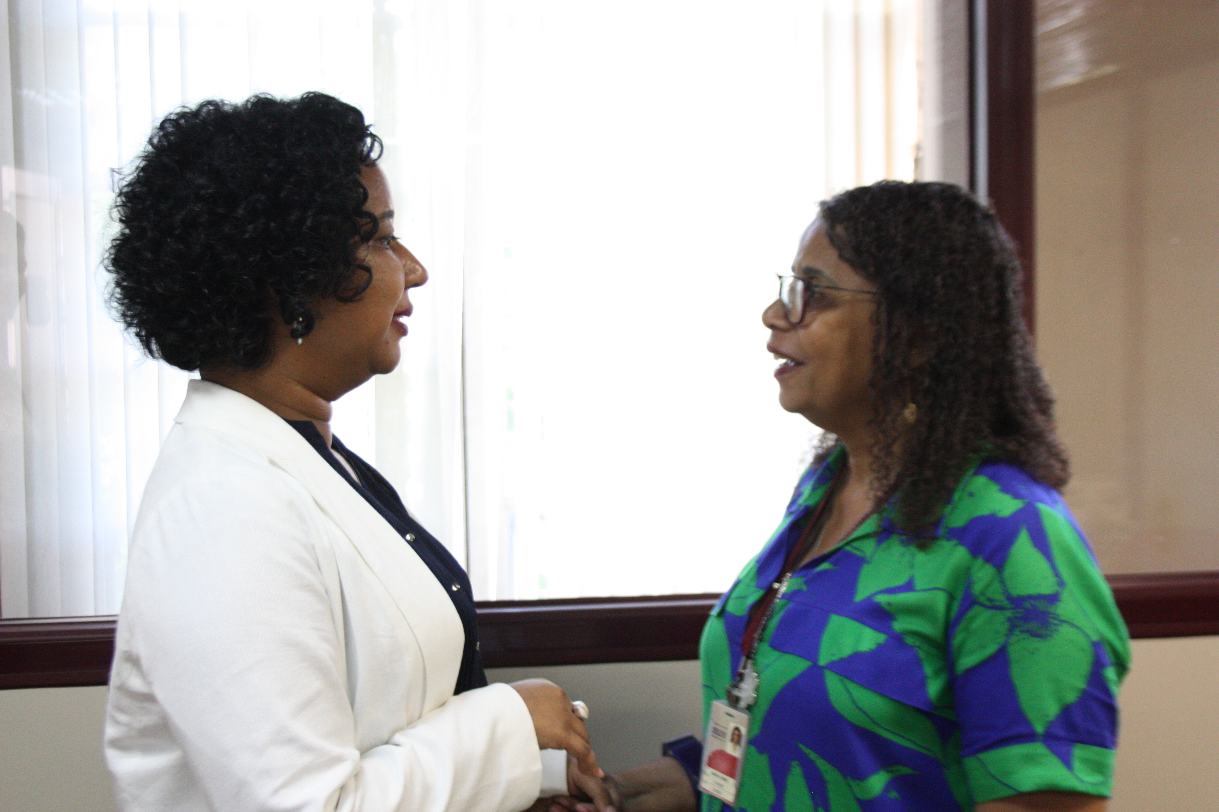 De passagem pela Superintendência de Gestão de Documentos e Arquivos, a futura Diretora-Geral cumprimentou Maria Izabel de Oliveira, a única mulher negra a ocupar o cargo antes dela. Servidora do AN há mais de 30 anos, Maria Izabel foi Diretora-Geral interina em 2016, após a gestão de Jaime Antunes da Silva.