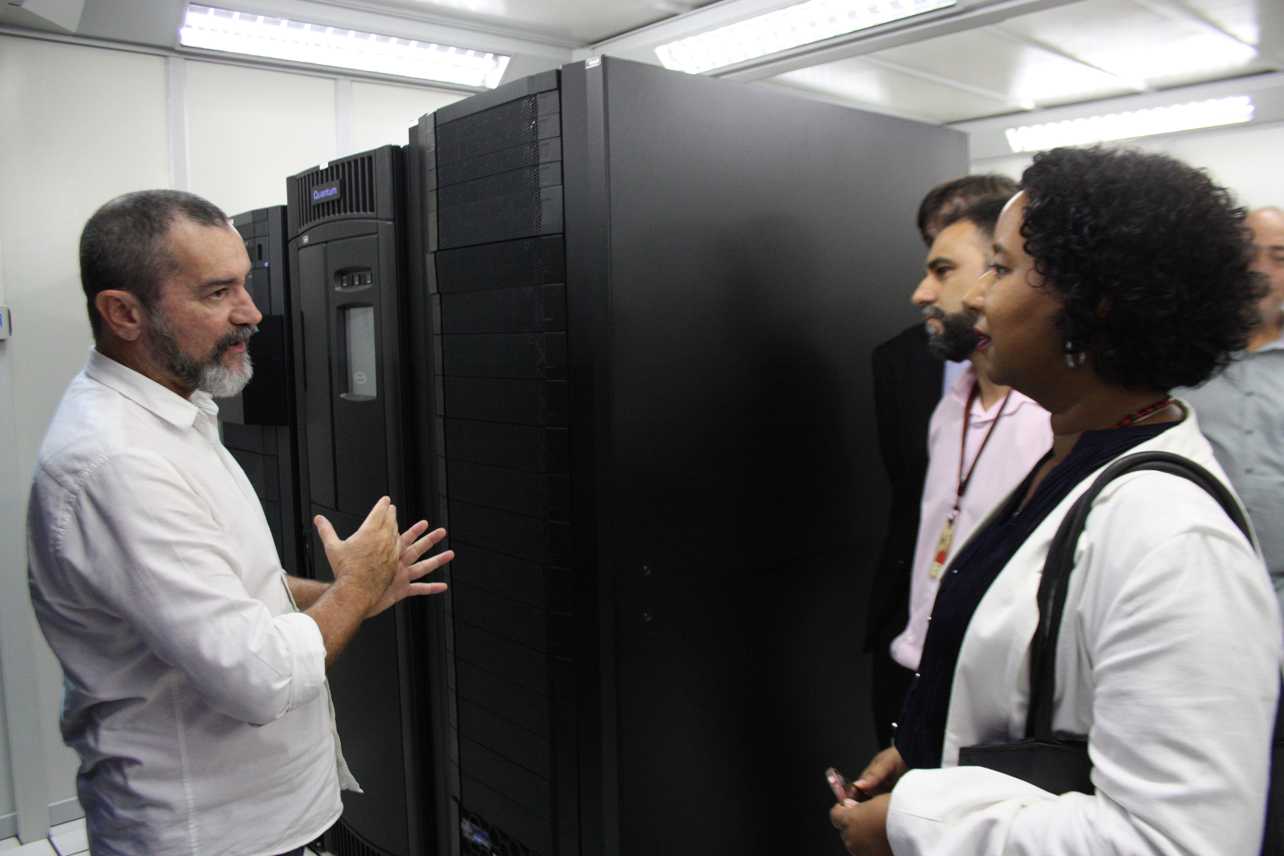 Em seguida, Ana Flávia teve a oportunidade de conhecer o datacenter onde está instalada a infraestrutura de Tecnologia da Informação dedicada a receber os documentos digitais da administração pública federal. Nesse storage , são armazenadas as matrizes e cópias digitais do acervo, com o intuito de dar acesso on-line aos documentos e, simultaneamente, preservar os originais em suporte convencional (papel, película, fita magnética, etc.). Além disso, o datacenter já recebe os documentos públicos produzidos e recolhidos em meio digital, como planilhas, e-mails , bases de dados, etc.