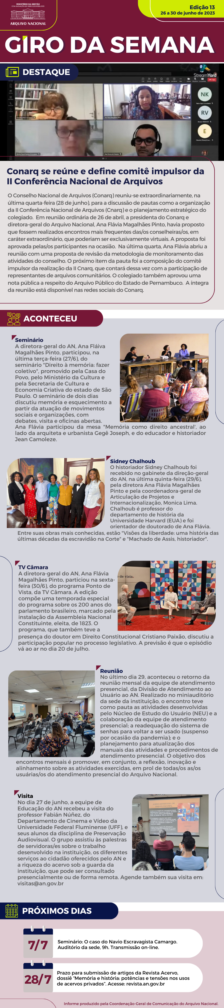 Notícias Notícias de 26 a 30 de junho Compartilhe: Compartilhe por Facebook Compartilhe por Twitter Compartilhe por LinkedIn Compartilhe por WhatsApp link para Copiar para área de transferência Publicado em 03/07/2023 18h12