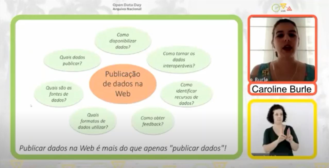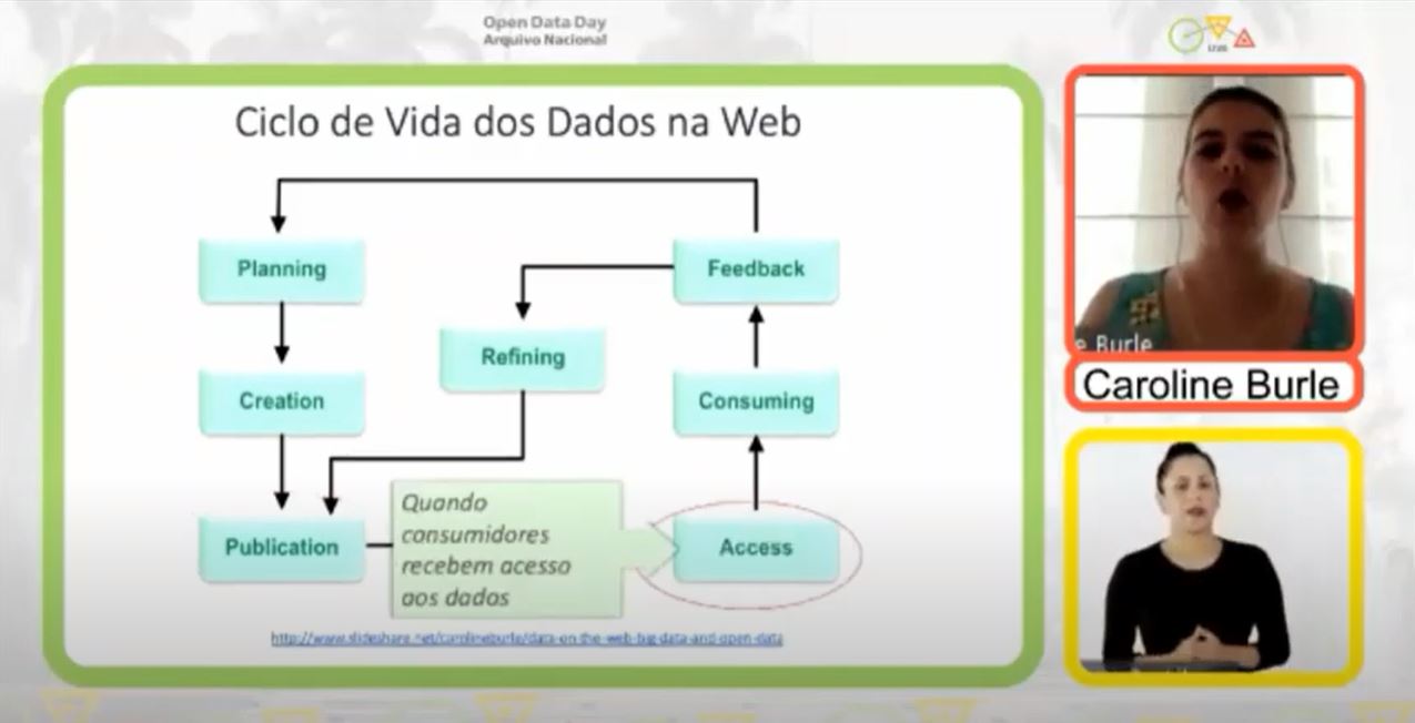 No evento, ela iniciou sua apresentação, falando sobre o ciclo de dados na web , desde sua criação, passando por sua extração das fontes originais e pela transformação para acesso posterior.