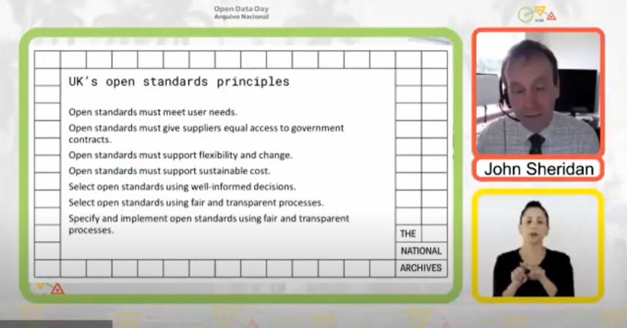 Diretor digital do The National Archives UK – TNA UK, John Sheridan falou sobre o papel e a importância de um arquivo público no que diz respeito a dados abertos, uma vez que eles traduzem uma forma de se enxergar o governo e o Estado, suas decisões e suas ações. Segundo ele, é possível entender como um governo entende um país por meio dos dados que seu arquivo nacional disponibiliza para o público.
