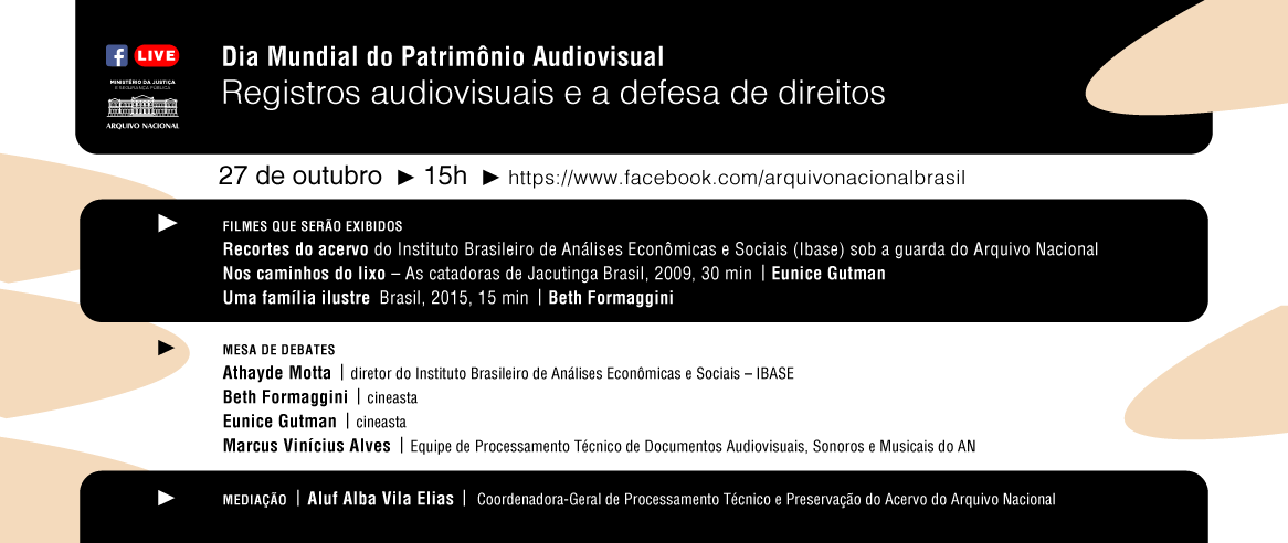 O objetivo deste evento de comemoração do Dia Mundial do Patrimônio Audiovisual é apresentar diferentes produções audiovisuais que, de alguma maneira, estão ligadas a questões de cidadania, defesa de direitos, meio ambiente e ações sociais, destacando assim a importância da preservação de documentos audiovisuais por instituições públicas, diante dos desafios tecnológicos da modernidade, como garantia de amplo acesso à informação e ao exercício de seus direitos sociais. Após a exibição das produções, propomos uma mesa de debate composta por produtores desses registros audiovisuais, por representantes de instituições de guarda desses documentos e/ou algum pesquisador do assunto.