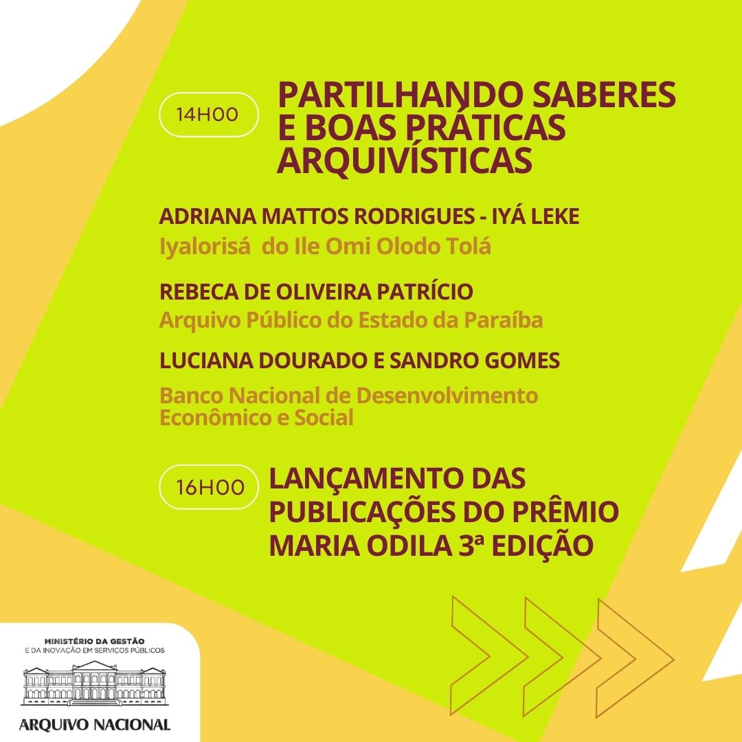 A programação contará com dois momentos. No primeiro, às 14h, representantes de instituições arquivísticas de destaque compartilharão suas melhores práticas e experiências sobre o mundo da Arquivologia. No segundo, às 16h, celebraremos o talento e a excelência na Arquivologia ao lançar, junto com os autores, as publicações premiadas no Prêmio de Arquivologia Maria Odila Fonseca 2021. Essas obras destacam-se por sua contribuição significativa para o campo, e serão uma fonte valiosa de inspiração para estudantes e profissionais da área, como segue: