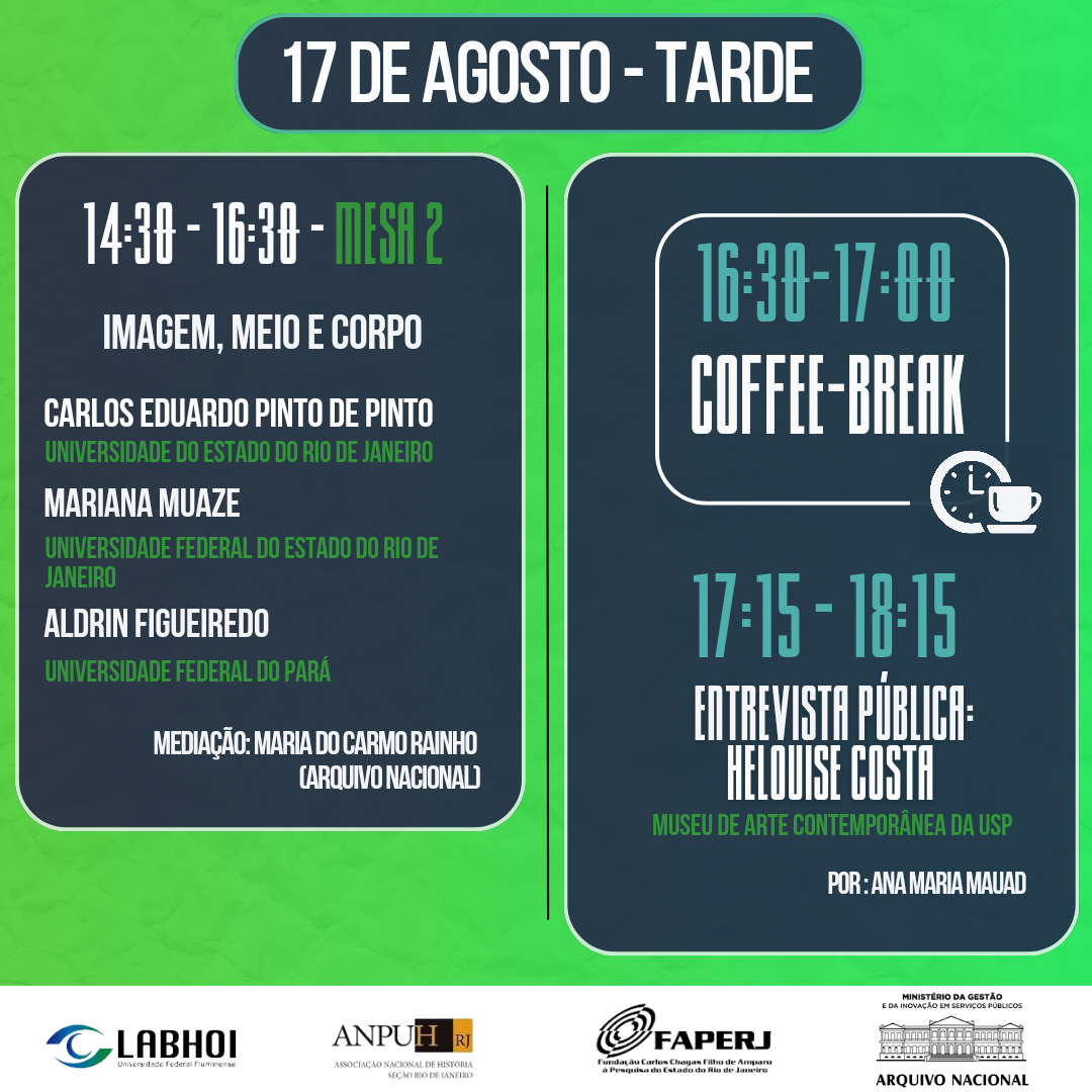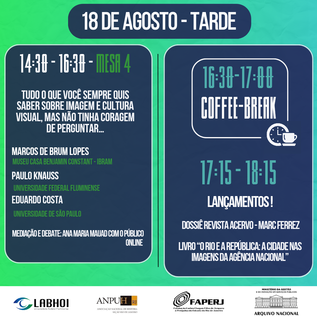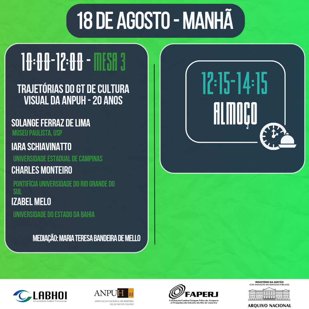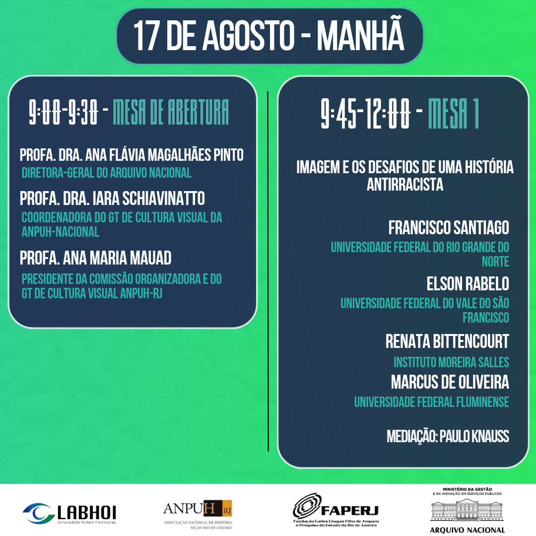 A abertura, na manhã do dia 17/8, contará com a presença da diretora-geral do Arquivo Nacional, Ana Flávia Magalhães Pinto, da coordenadora do GT de Cultura Visual da ANPUH-Nacional, Iara Schiavinatto, e da presidente da Comissão Organizadora e do GT de Cultura Visual Anpuh-RJ, Ana Maria Mauad. O evento é presencial, e as inscrições podem ser realizadas