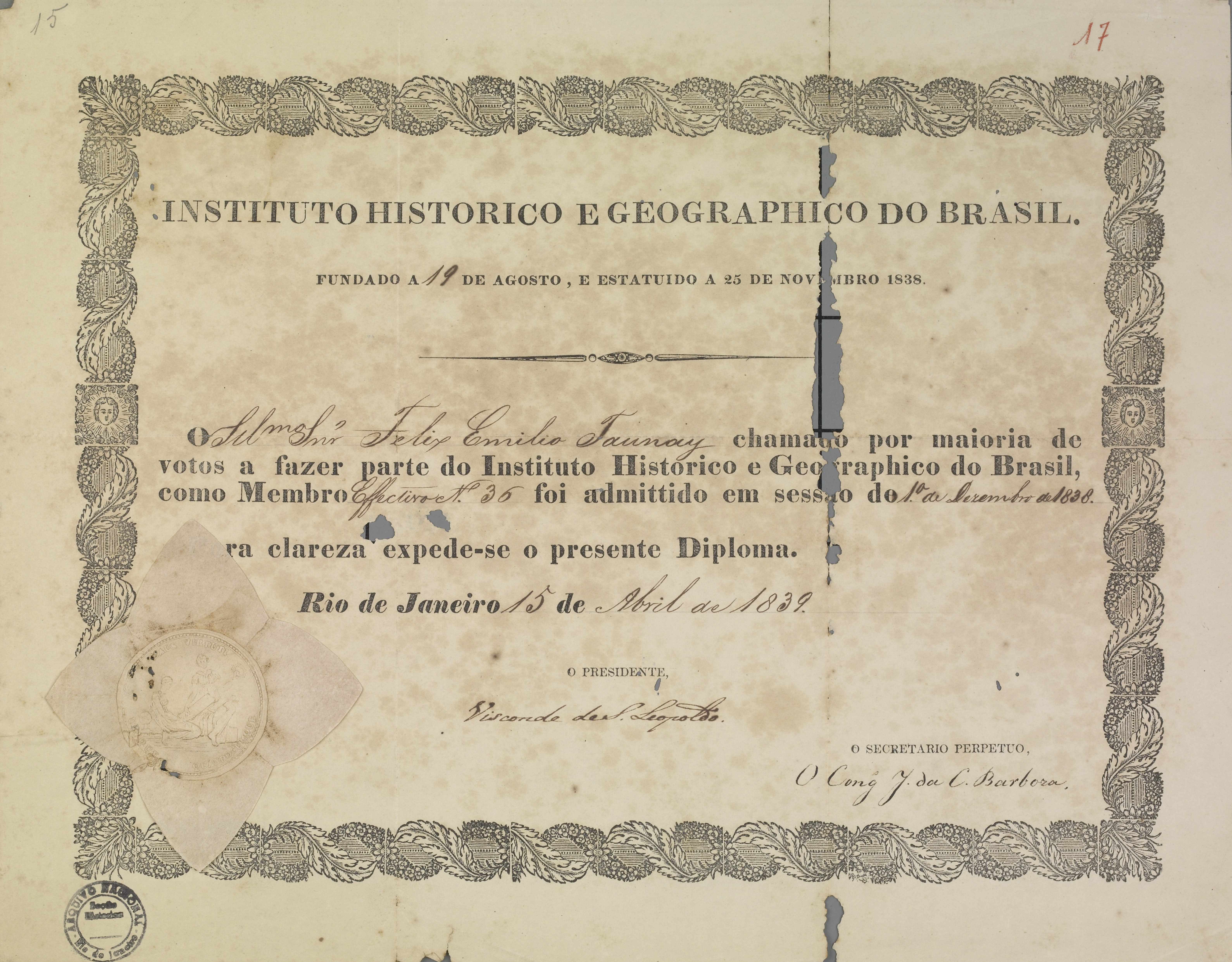 No arquivo privado de Taunay, além dos diplomas do IHGB e da Academia Imperial de Belas Artes, encontram-se sua nomeação para professor de desenho e paisagem do imperador e das irmãs, poesias que escreveu e traduziu, projetos de prédios, correspondências, entre outros documentos.