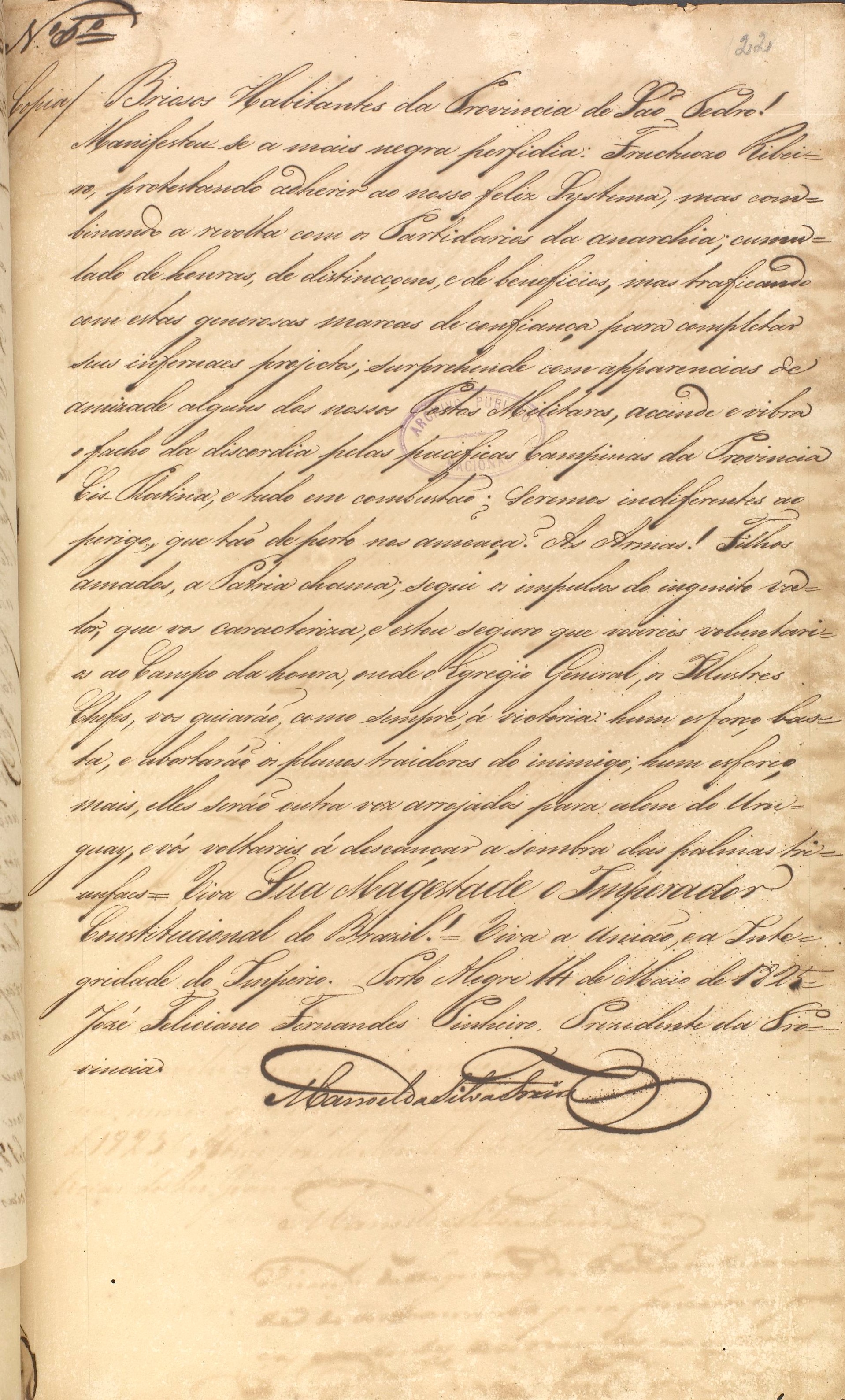 Manifestou-se a mais negra perfídia. Frutuoso Ribeiro, protestando aderir ao nosso feliz sistema, mas combinando a revolta com os partidários da anarquia; cumulado de honras, de distinções, e de benefícios, mas traficando com estas generosas marcas de confiança para completar seus infernais projetos; surpreende com aparências de amizade alguns dos nossos postos militares, acende e vibra o facho da discórdia pelas pacíficas campinas da província Cisplatina, e tudo em combustão. Seremos indiferentes ao perigo, que tão de perto nos ameaça? Às armas! Filhos amados, a pátria chama; segui os impulsos do ingênito valor, que vos caracteriza, e estou seguro que voareis voluntários ao campo da honra, onde o egrégio general, os ilustres chefes, vos guiarão, como sempre, à vitória: hum esforço basta, e abortarão os planos traidores do inimigo; um esforço mais, eles serão outra vez arrojados para além do Uruguai, e vós voltareis à descansar a sombra das palmas triunfais = Viva Sua Majestade o Imperador Constitucional do Brasil! = Viva a união, e a integridade do Império. Porto Alegre 14 de maio de 1825 = José Feliciano Fernandes Pinheiro. Presidente da província.