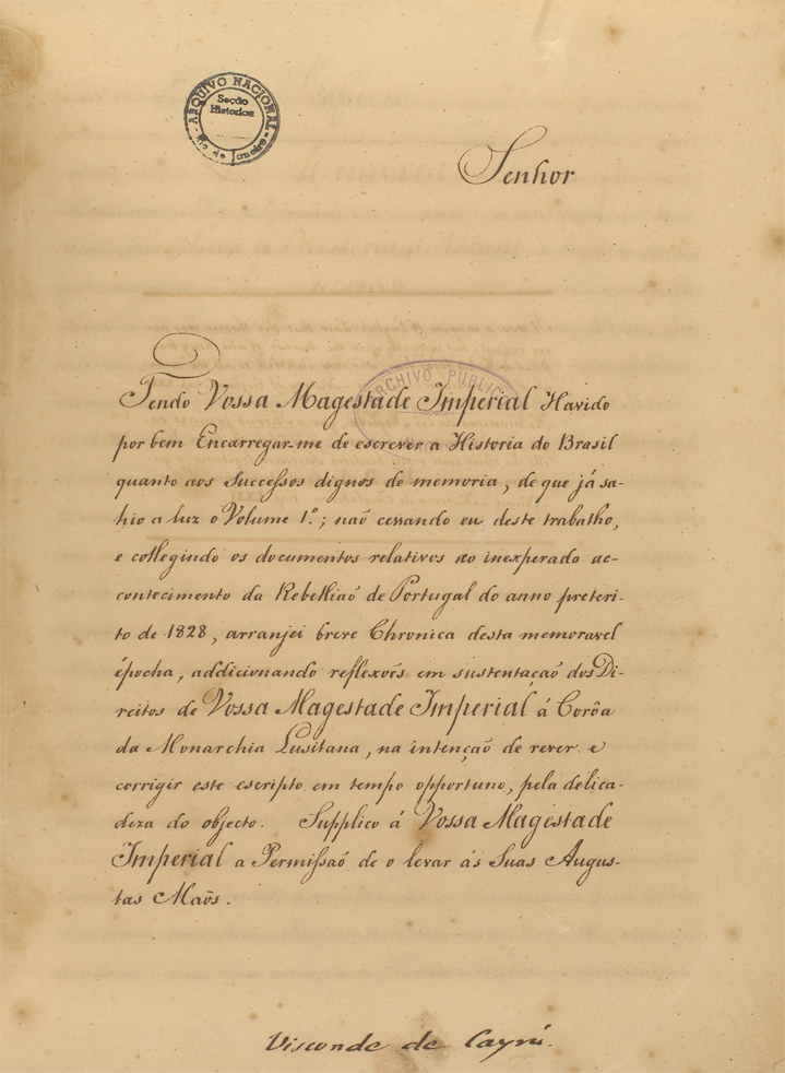Tendo vossa majestade imperial havido por bem encarregar-me de escrever a História do Brasil quanto aos sucessos dignos de memória, de que já saiu a luz o volume 1º; não cessando eu deste trabalho, e coligindo os documentos relativos ao inesperado acontecimento da Rebelião de Portugal do ano pretérito de 1828, arranjei breve crônica desta memorável época, adicionando reflexões em sustentação dos direitos de vossa majestade imperial à coroa da monarquia lusitana, na intenção de rever e corrigir este escrito em tempo oportuno, pela delicadeza do objeto. Suplico à vossa majestade imperial a permissão de o levar às suas augustas mãos.