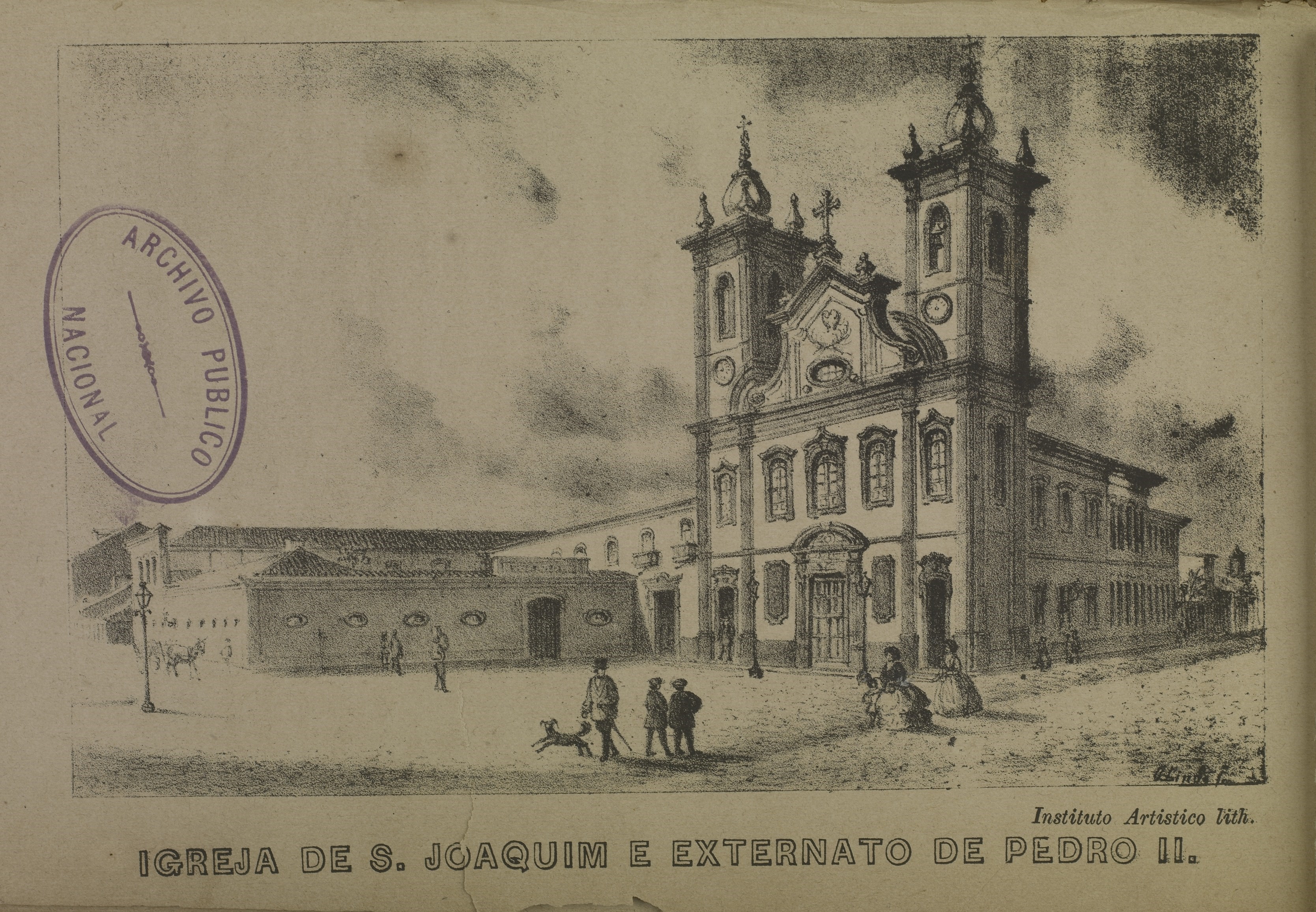 Litografia do Imperial Colégio de Pedro II e da Igreja de São Joaquim, localizados na rua Larga de São Joaquim, no Centro do Rio de Janeiro (hoje rua Marechal Floriano), feitas pelo Imperial Instituto Artístico. A imagem faz parte do livro Um passeio pela cidade do Rio de Janeiro, que traz uma extensa descrição e história do colégio de d. Pedro II, escrito pelo célebre romancista, médico e professor brasileiro, Joaquim Manuel de Macedo.