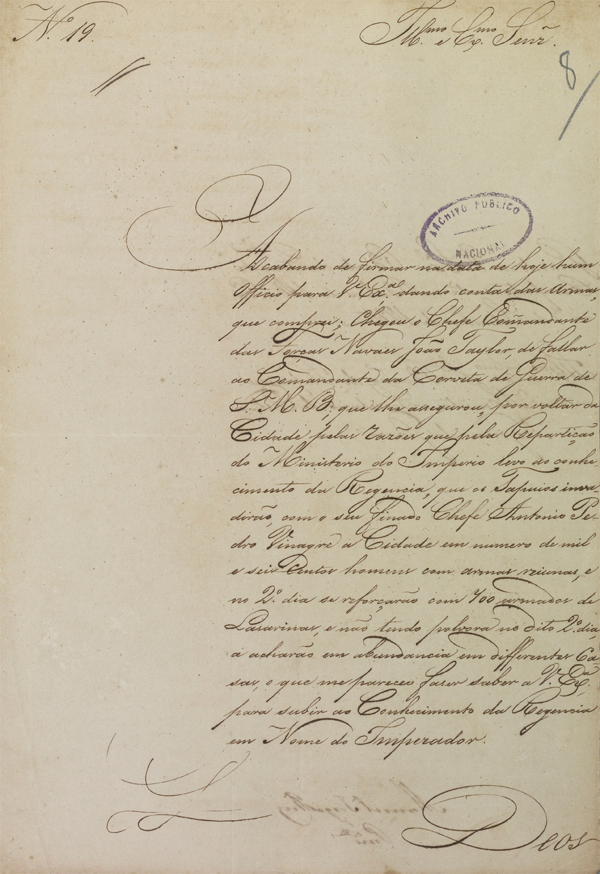 Comunicado acerca da chegada do comandante naval John Taylor, para liderar as forças navais imperiais no Pará, e da compra de armamento. Também dá conta da invasão das tropas “tapuias” de Vinagre. Dirigida ao ministro da Guerra, Barão de Itapicurú Mirim. Escrita e enviada por Manuel Jorge Rodrigues a bordo da fragata Campista, fundeada na baía do Pará, em 7 de setembro de 1835. Série Guerra. BR RJANRIO DA IG1-10.