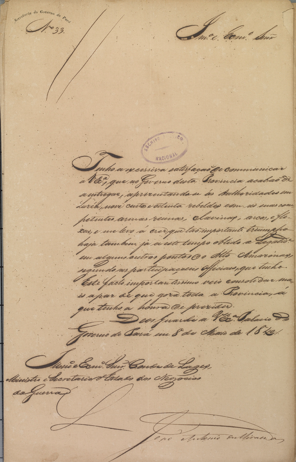 Relato de Manoel Jorge Rodrigues segundo o qual os irmãos rebeldes Vinagre estariam preparando uma imensa ofensiva à “gente branca,” lamenta a falta de tropas e navios. Dirigido ao ministro da Guerra Barão de Itapicurú Mirim. Pará, 8 de agosto de 1835. Série Guerra. BR RJANRIO DA IG1-10.