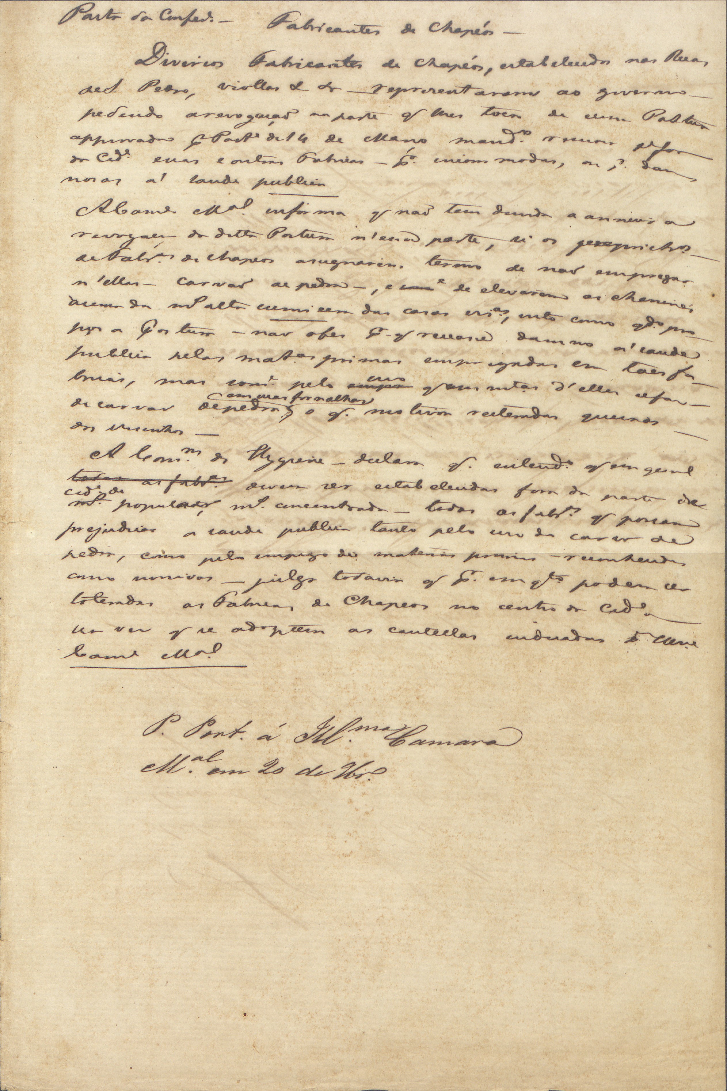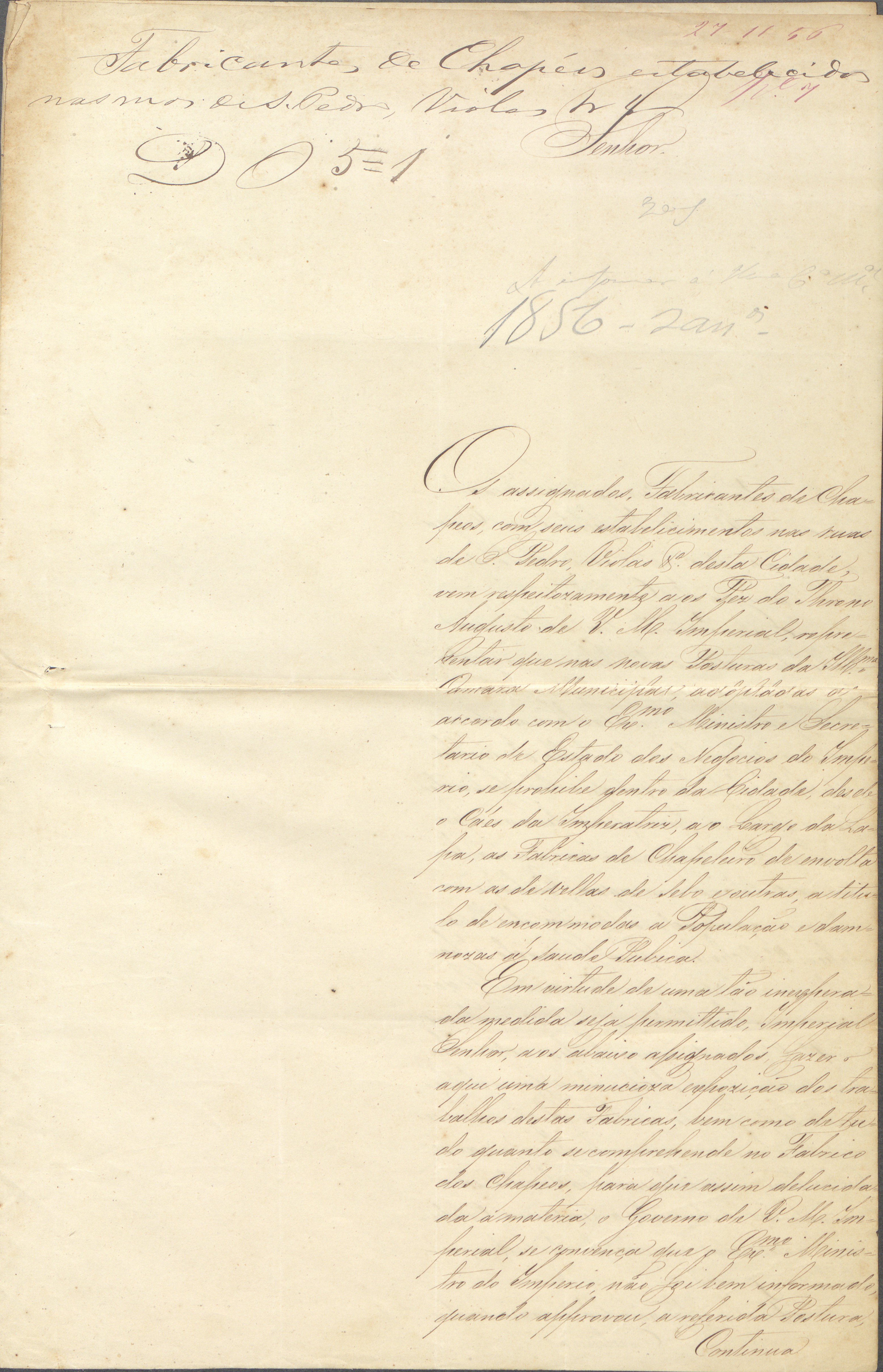 Em 11 de junho de 1856, um grupo de fabricantes de chapéus das ruas de São Pedro, das Violas e de outros logradouros do Rio de Janeiro enviou uma representação à Sua Majestade Imperial, demonstrando surpresa e descontentamento com o edital da Câmara Municipal que impactaria consideravelmente os seus negócios: a proibição de fábricas e de oficinas que pudessem incomodar ou provocar danos à saúde pública no centro da cidade. Insatisfeitos, os chapeleiros produziram o documento, solicitando que o Imperador fizesse uma revisão da medida para tentar preservar os seus estabelecimentos.[1]
