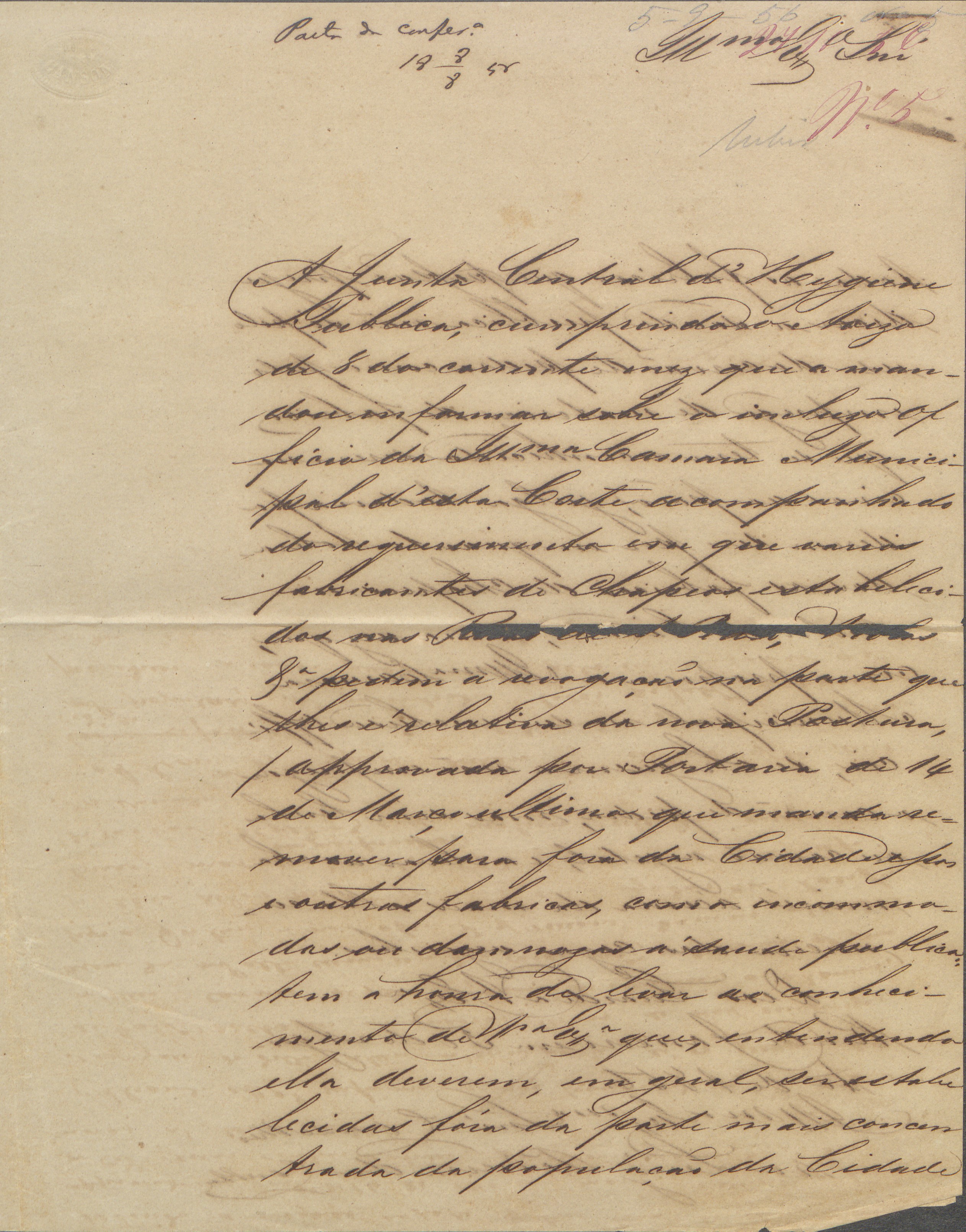Dessa forma, o presente parecer, junto do despacho da Câmara Municipal, foi direcionado à Junta Central de Higiene Pública, conforme relatado por Almeida Vasconcelos, em 4 de agosto de 1856. Neste documento de encaminhamento, Vasconcelos destacou o número de dez fabricantes de chapéus