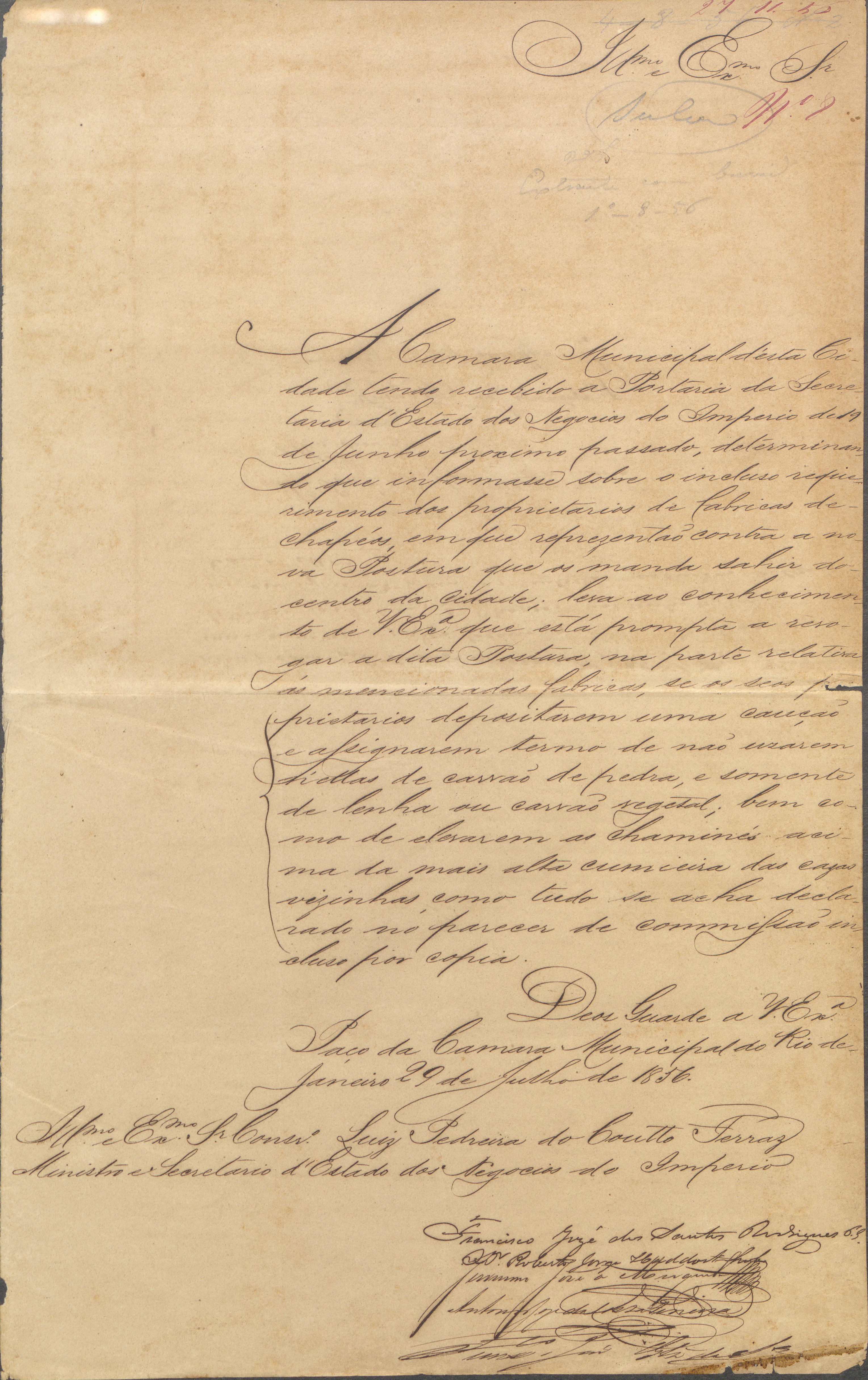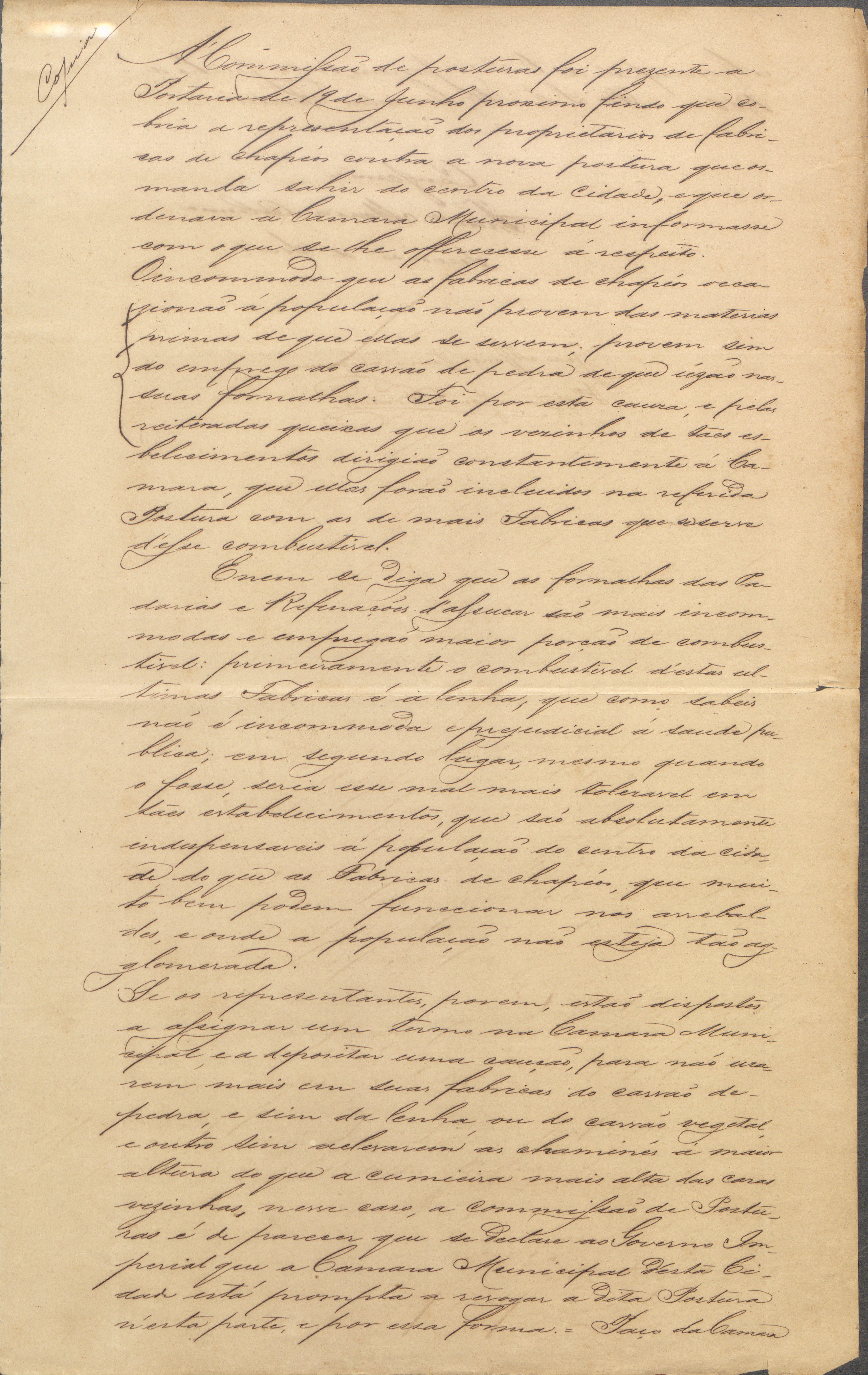 A parte do fundo sobre o Ministério do Império (1868-1874) apresenta o requerimento dos chapeleiros e ainda os demais documentos relacionados ao caso.[21] A Câmara Municipal foi informada da questão por meio de portaria de 19 de junho, tendo emitido um parecer favorável à revogação da postura em 29 de julho de 1856, na parte relacionada às fábricas de chapéus. No entanto, haveria uma condição: de que os proprietários depositassem uma caução e ainda assinassem um termo se comprometendo a não usarem carvão de pedra, somente lenha, ou carvão vegetal, além de elevarem as chaminés acima do pico das casas vizinhas, conforme parecer da Comissão de Posturas de 16 de julho de 1856.A Comissão de Posturas justificou a medida de retirada das fábricas de chapéus por causa do uso de carvão de pedra e das recorrentes queixas dos vizinhos dessas fábricas, e não pelo uso dos materiais empregados no fabrico desses gêneros. Quanto à argumentação dos chapeleiros que citaram o caso das padarias e refinações de açúcar, a comissão destacou que as refinações de açúcar utilizavam lenha em vez de carvão de pedra, não sendo, portanto, incômodas ou prejudiciais à saúde, além disso, os estabelecimentos seriam indispensáveis à população do centro da cidade, diferentemente das fábricas de chapéus, que poderiam funcionar nos arrabaldes da cidade, onde não houvesse aglomeração de pessoas. A Comissão de Posturas declarou ainda que, se os chapeleiros estivessem dispostos a depositar caução para não usarem em suas fábricas o carvão de pedra, mas antes lenha, ou mesmo carvão vegetal, além de aumentarem o tubo das chaminés de forma que ficasse mais alta que a cumeeira das casas vizinhas, a Câmara poderia revogar a postura.