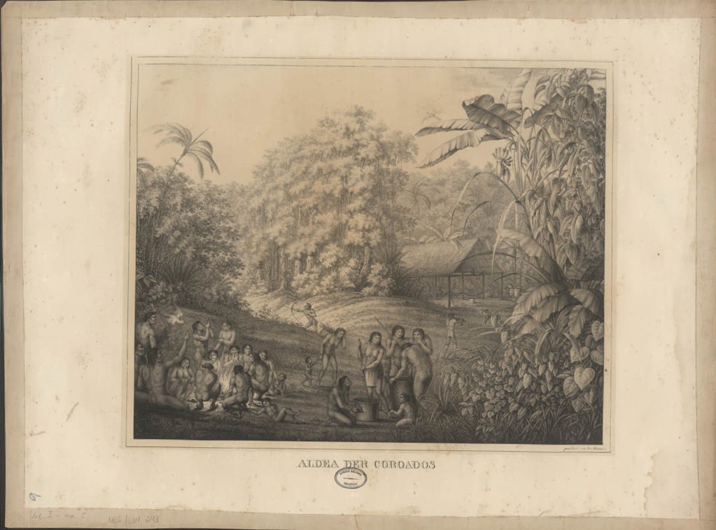 Aldeia dos coroados. In: SPIX, Johann Baptist Von; MARTIUS, Karl Friedrich Philipp Von. Reise in Brasilien auf Befehl Sr. Majestat Maximilian Joseph I Königs von Bairen in den Jahren 1817 bis 1820 gemacht und beschrieben . Munchen: Gedruckt bei M. Lindauer, 1823-1831. OR 1710 prancha 9