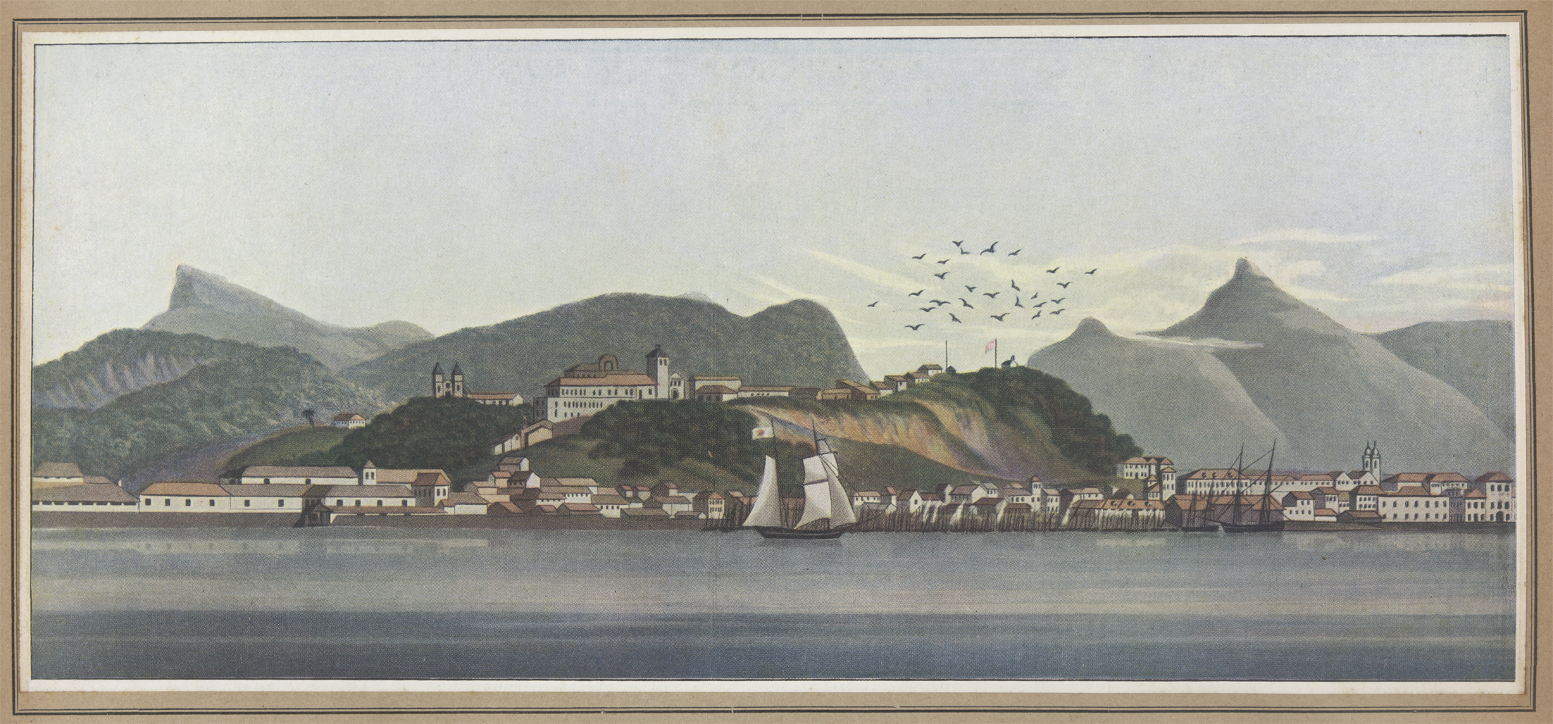 Vista da cidade do Rio de Janeiro, tendo ao centro o Morro do Castelo. CHAMBERLAIN, Henry. MORAES, Rubens Borba de (trad.) Vistas e costumes da cidade e arredores do Rio de Janeiro em 1818-1820 . 1ª edição no Brasil, fac-símile. Rio de Janeiro: Livraria Kosmos Editora, 1943. OR 1985 pg32