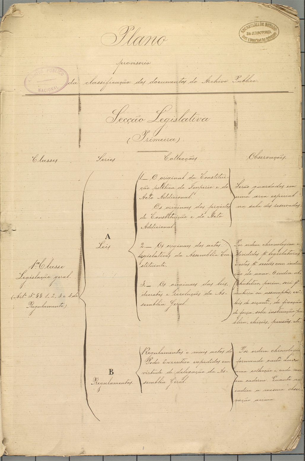 Plano Provisório de Classificação dos Documentos do Arquivo Público do Império, dividido nas seções Legislativa, Administrativa, Judiciária e Histórica, e ainda por classes, séries e coleções. Rio de Janeiro, 20 de setembro de 1876. Diversos - SDH - caixas. BR RJANRIO 2H cx 2625 pct. 3 plano provisório f01