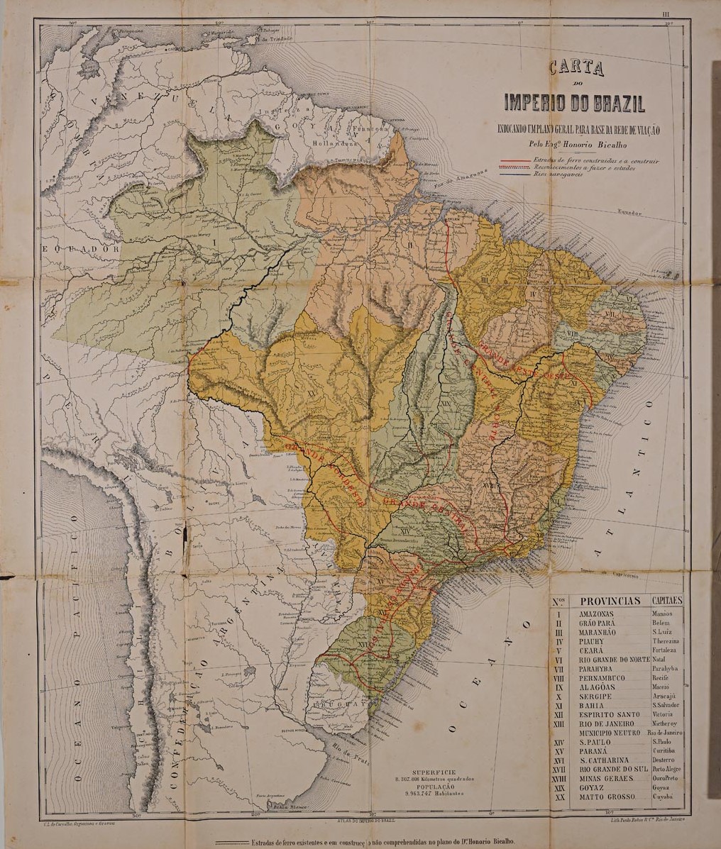 Carta do Império do Brasil indicando um plano geral para base da rede de viação, pelo engenheiro Honório Bicalho. Rio de Janeiro, 1883. Arquivo Marcos Carneiro de Mendonça. BR RJANRIO U0.0.MAP.1
