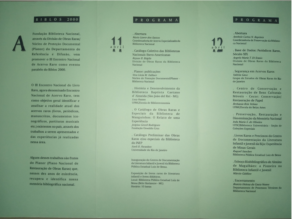 Errata: No dia 11 de abril de 2000, o trabalho “História de Desenvolvimento da Biblioteca Baptista Caetano d’Almeida (São João del Rei – MG), não foi apresentado, tendo sido substituído por duas comunicações: