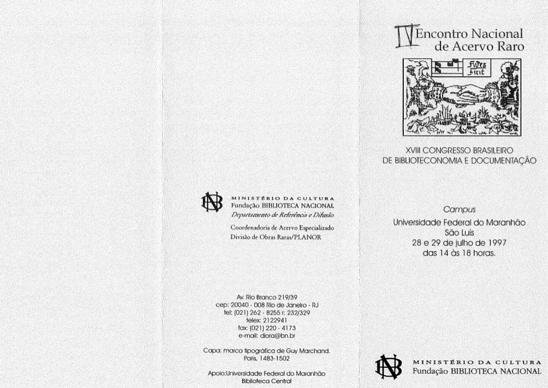 Folder: frente | verso - XI ENAR – Encontro Nacional de Acervo Raro - Gestão de acervos raros e especiais: realidade e desafios