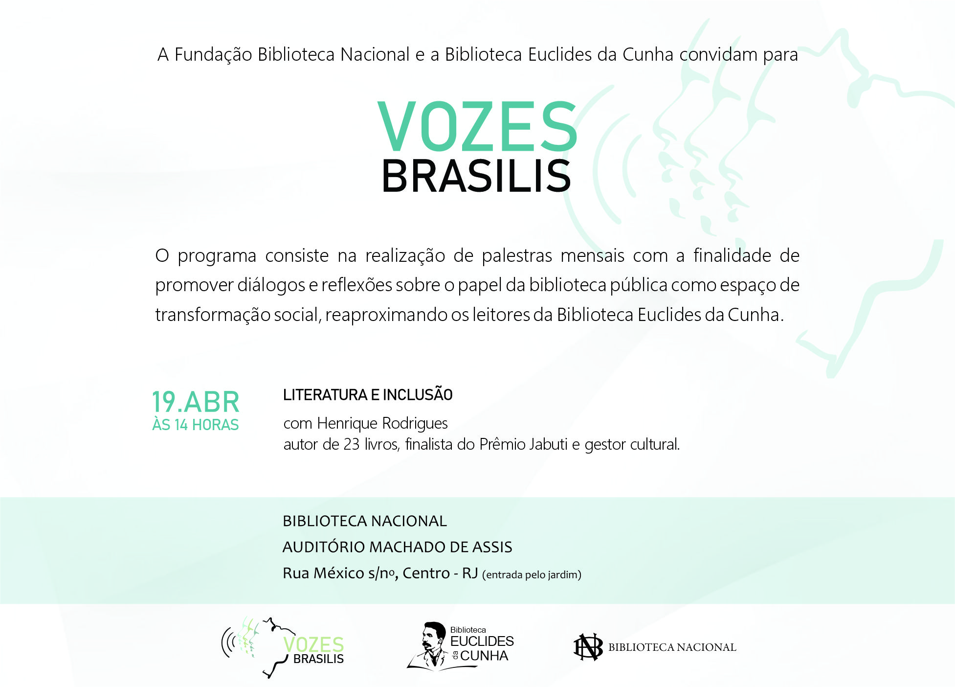 A Biblioteca Euclides da Cunha (BEC) , biblioteca pública da Fundação Biblioteca Nacional (FBN), tem a honra de convidar a todos e todas para participar do Programa "Vozes Brasilis ".