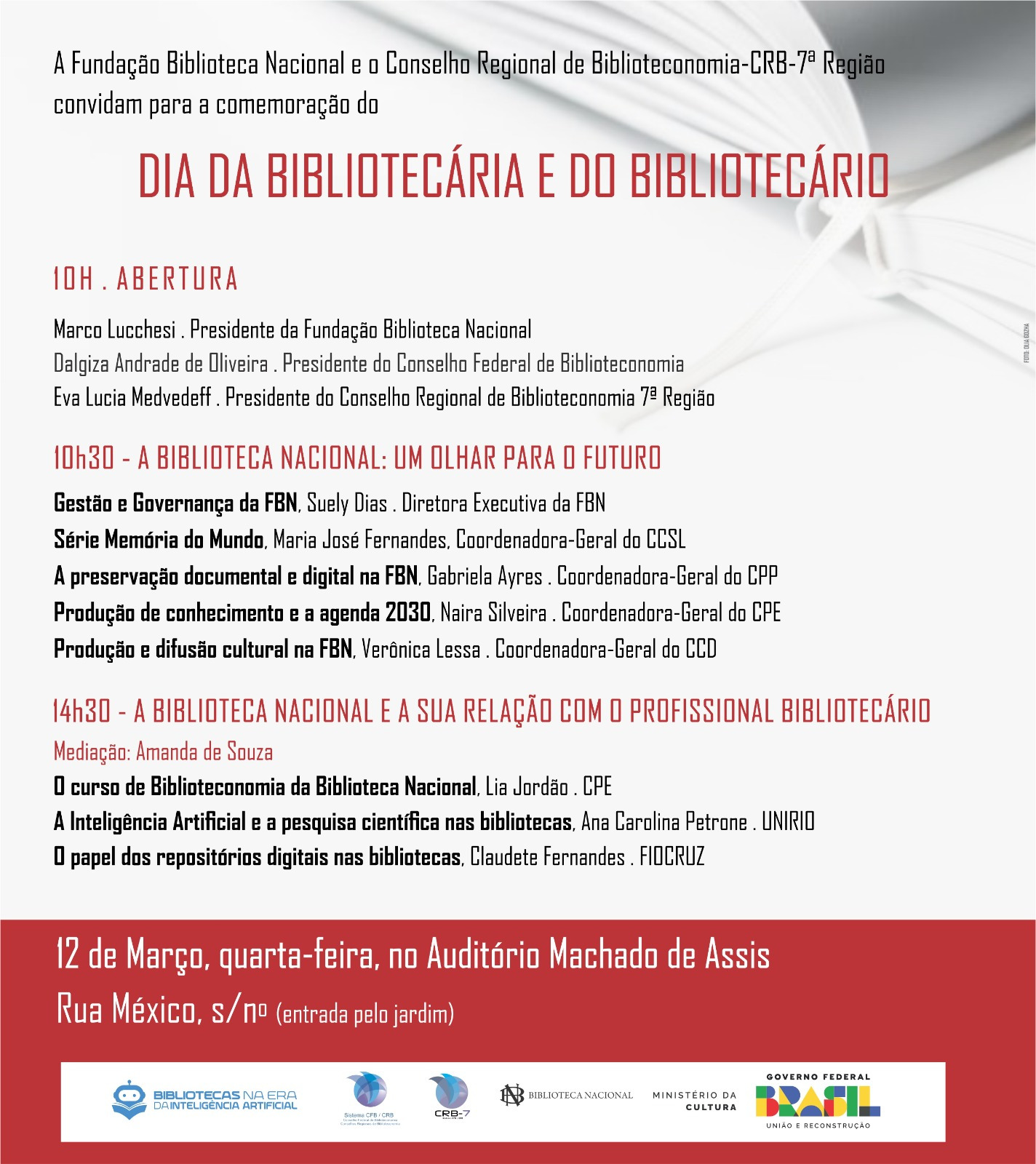 A Fundação Biblioteca Nacional (FBN) – entidade vinculada ao Ministério da Cultura (MinC) – e o Conselho Regional de Biblioteconomia (CRB – 7ª Região) convidam para o evento “Dia da Bibliotecária e do Bibliotecário”, no dia 12/03, das 10h às 16h, no Auditório Machado de Assis, na sede da FBN, no Centro do Rio de Janeiro. O evento contará com uma série de palestras que abordarão a importância e o futuro da Biblioteconomia, bem como a relação da Biblioteca Nacional com profissionais da área. A entrada é gratuita e haverá transmissão ao vivo pelo YouTube (@fundacaobibliotecanacional ).