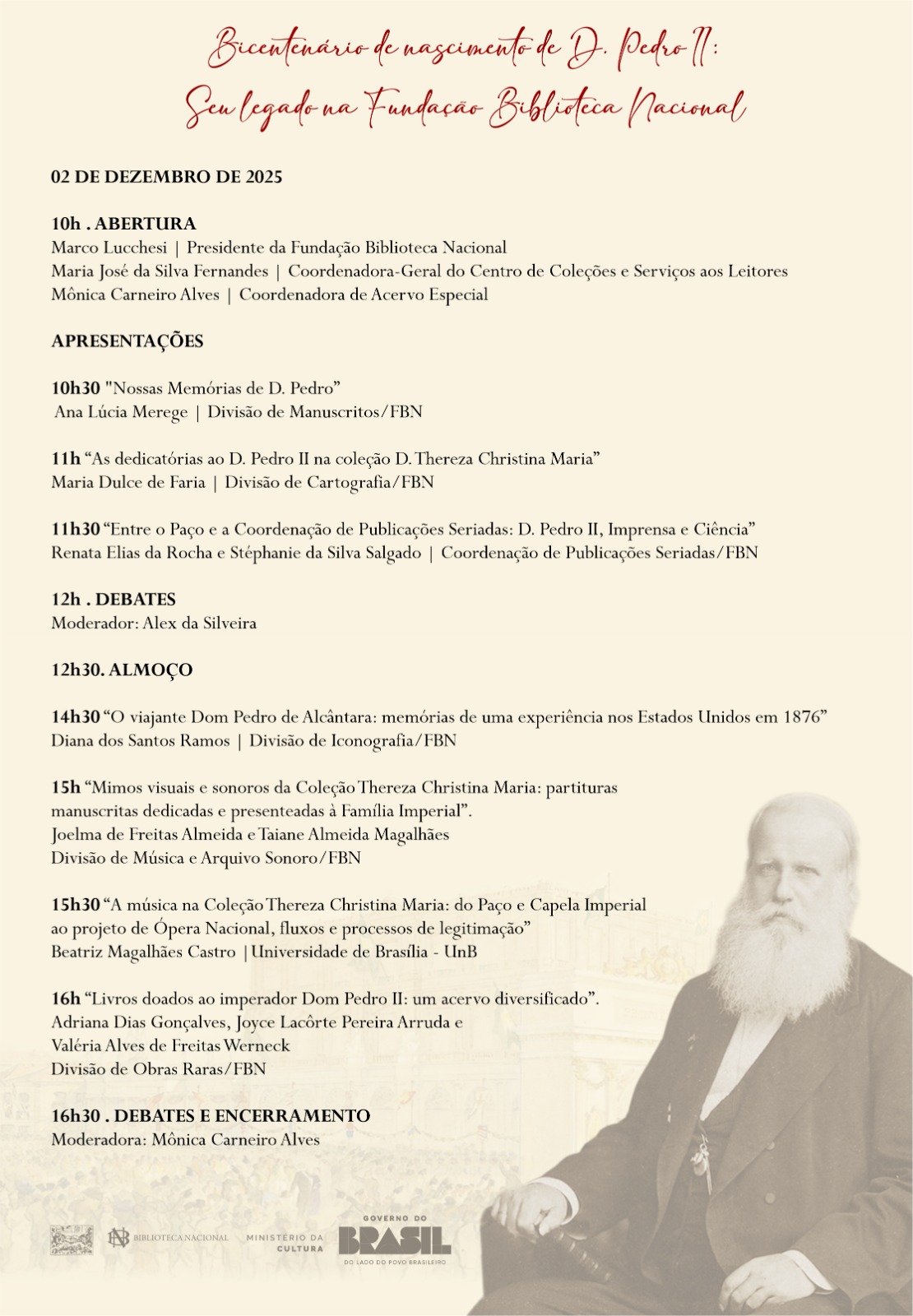 Em comemoração ao bicentenário de nascimento de D. Pedro de Alcântara, (D. Pedro II), que será celebrado em 02 de dezembro de 2025, as equipes curadoras de acervos da Fundação Biblioteca Nacional (FBN) e convidados, realizarão o seminário “Bicentenário de Nascimento de D. Pedro II: seu legado na Fundação Biblioteca Nacional”, onde serão apresentados trabalhos no âmbito da Coleção do Imperador depositada nas áreas de acervos da FBN.
