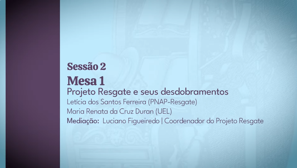 A conferência, dada no contexto da 11ª Jornada de Pesquisadores da Fundação Biblioteca Nacional. Conta com a apresentação das pesquisadoras Letícia Ferreira e Maria Renata Duran, também professora da Universidade Estadual de Londrina. A moderação foi realizada pelo historiador Luciano Figueiredo (UFF), coordenador do Projeto Resgate.
