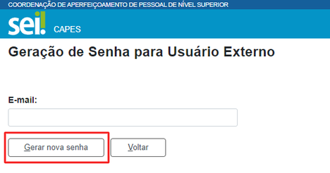 Na tela aberta, digite o e-mail informado no Formulário de Cadastro e em seguida clique em “Gerar nova senha”.