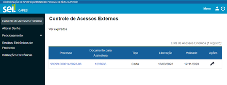 Assim, a Coordenação de Gestão de Documentos e a equipe responsável pelo Atendimento SEI na CAPES não possuem permissão para conceder o acesso externo a processos e documentos.