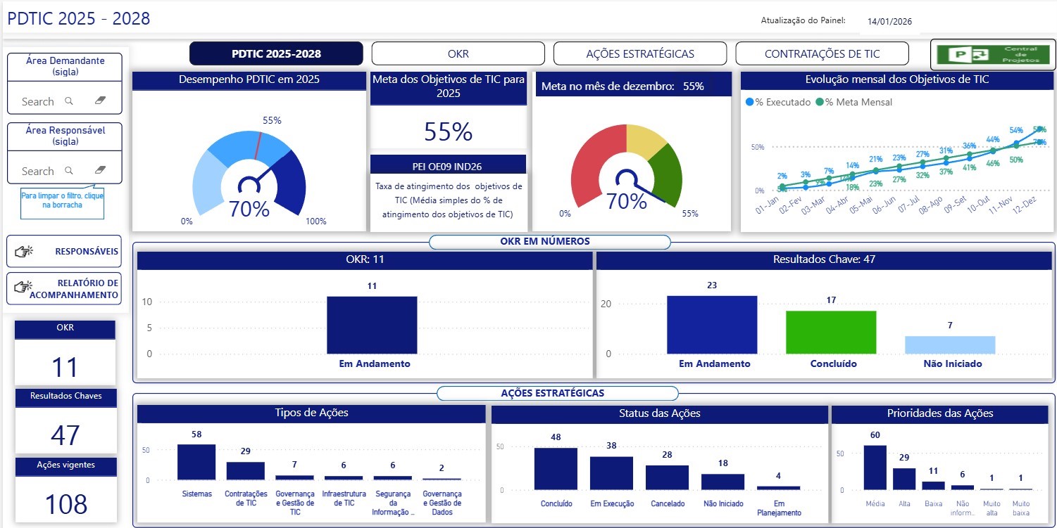 A imagem apresenta o painel de monitoramento do PDTIC 2025–2028 ao longo de 2025, exibindo indicadores de desempenho do Plano, metas estabelecidas para o ano e o progresso mensal das ações. O gráfico evidencia o acompanhamento dos OKRs, a situação dos Resultados-Chave e a distribuição das ações por tipo, prioridade e status de execução, permitindo visualizar o andamento das entregas de TIC e o cumprimento das metas estabelecidas para o período.