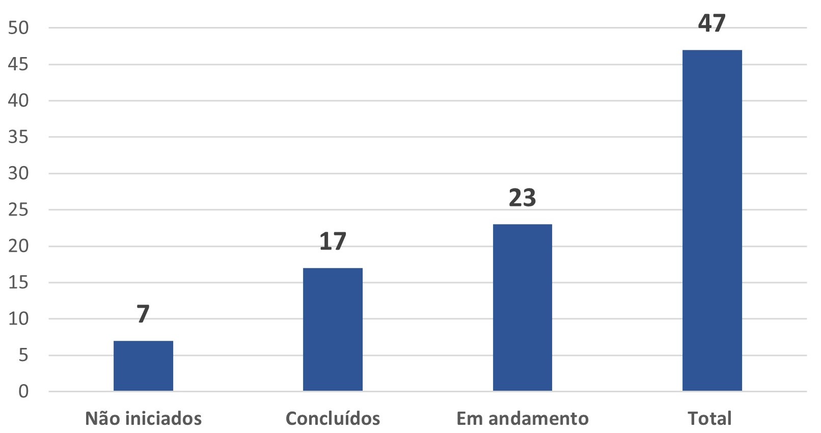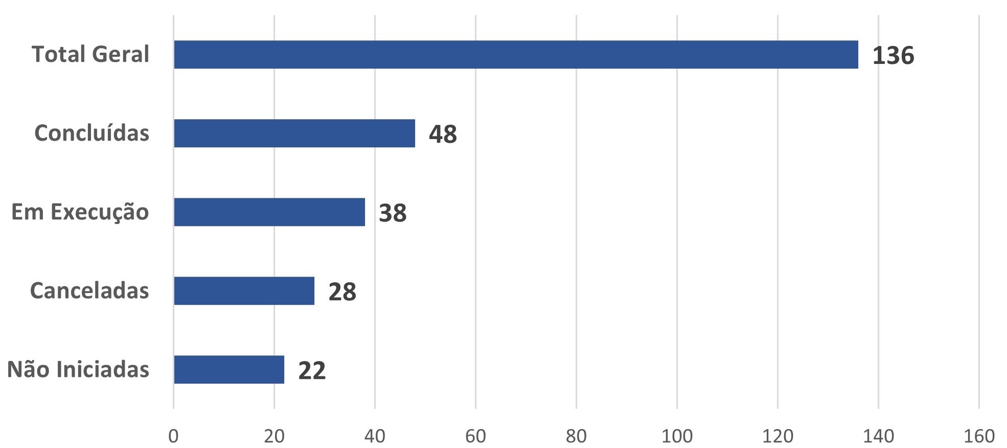 O monitoramento anual revela que foram requeridas 136 Ações Estratégicas de TIC, das quais 108 permaneceram em vigor ao final do exercício, após revisões e ajustes de planejamento.