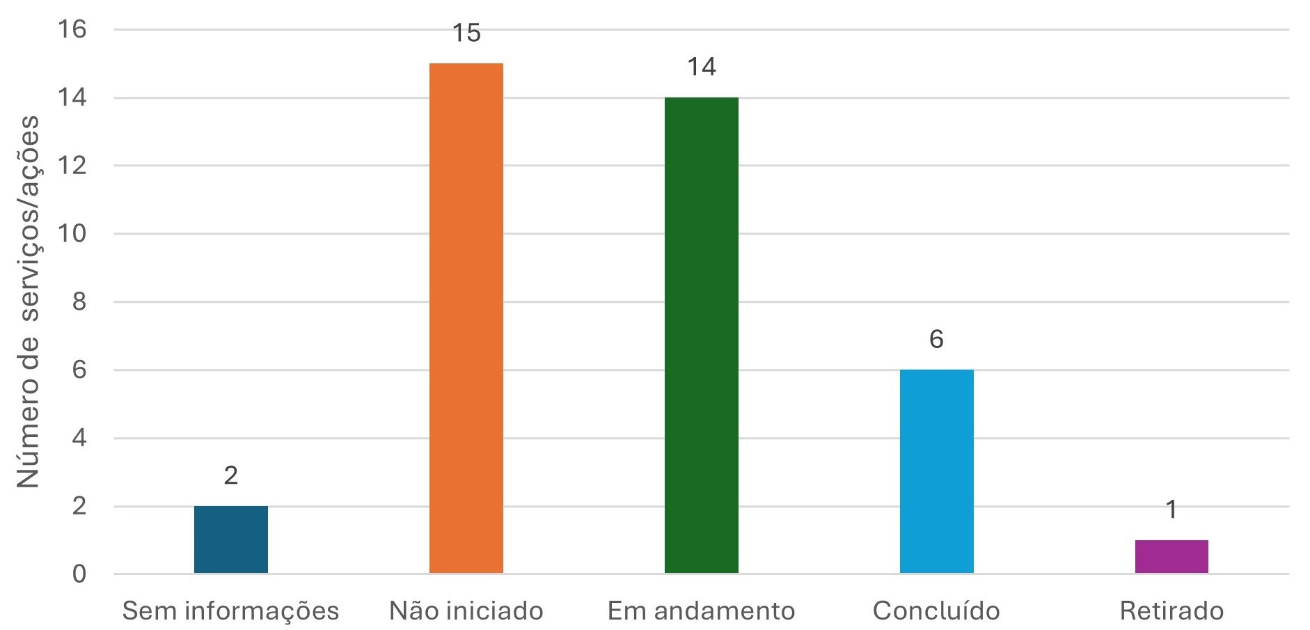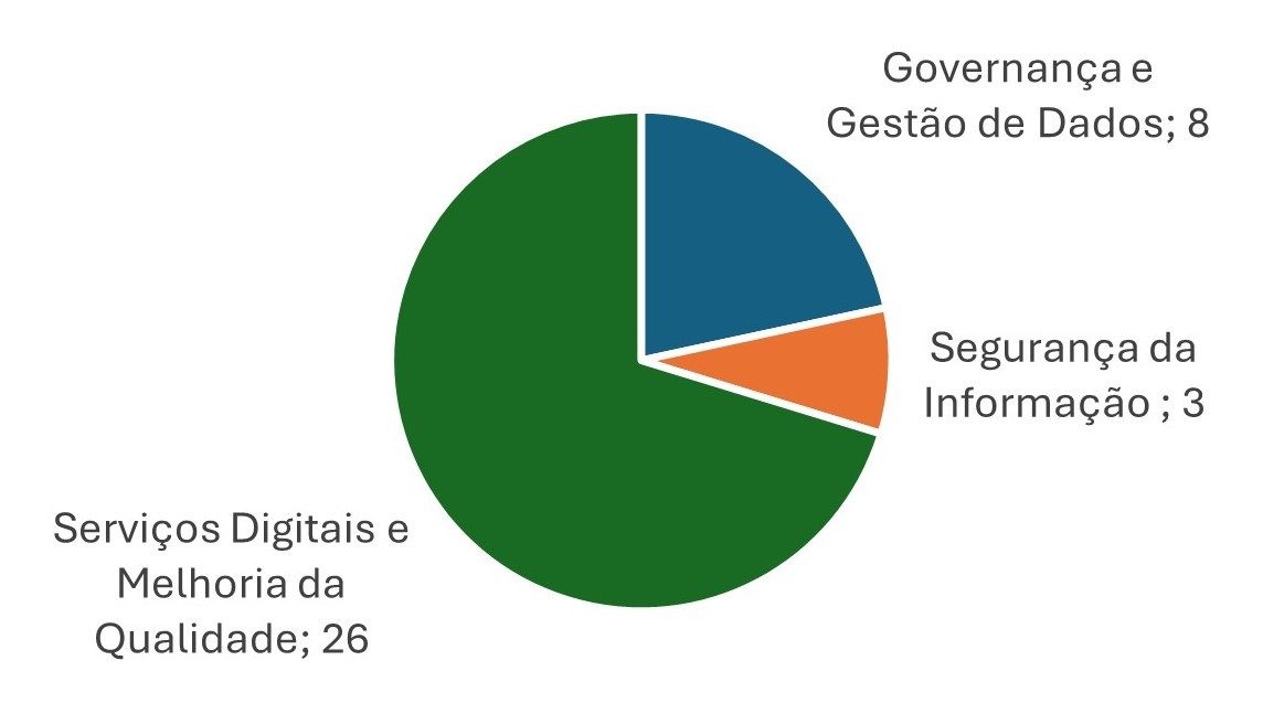 No que se refere às entregas pactuadas, constam atualmente 37 ações, distribuídas entre os eixos de Serviços Digitais e Melhoria da Qualidade, de Governança e Gestão de Dados e de Segurança e Privacidade, conforme demonstrado no gráfico.