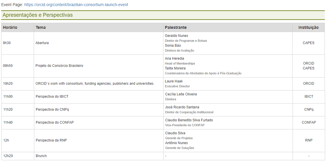 O evento de lançamento do consórcio do ORCID, a realizar-se no dia 22 de maio na CAPES em Brasília, contará com membros do consórcio, parceiros internacionais e representantes do ORCID.