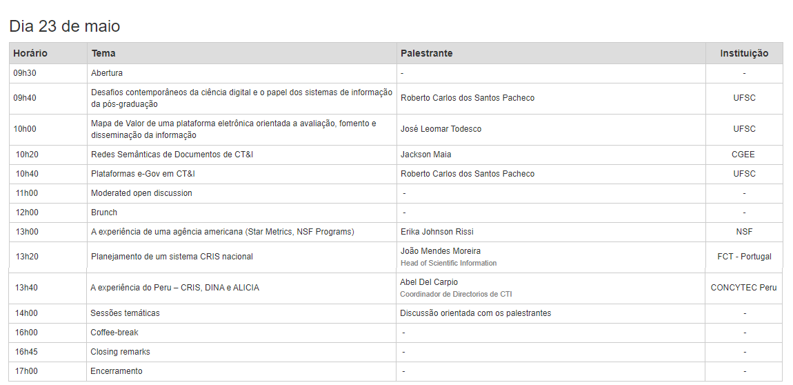 Ainda, no dia 23 de maio, vamos discutir como os sistemas de informação e a gestão do conhecimento podem apoiar as organizações e agências governamentais na redução da sobrecarga de trabalho, na otimização de processos e na melhoria da qualidade dos dados. Contaremos com a presença de especialistas nacionais e internacionais em temas de governo eletrônico, sistemas CRIS, interoperabilidade de sistemas e qualidade de dados.