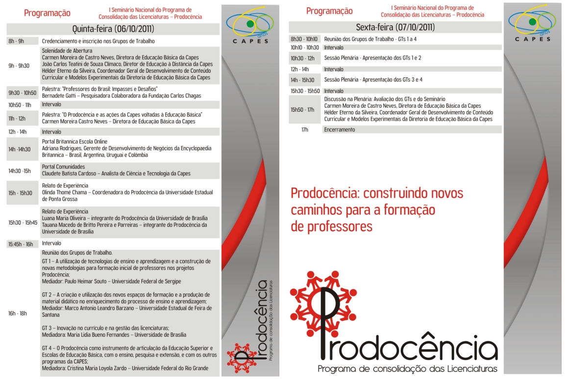 Acontece nos dias 06 e 07 de outubro, no edifício-sede da Coordenação de Aperfeiçoamento de Pessoal de Nível Superior (Capes), em Brasília, o I Seminário Nacional do Programa de Consolidação das Licenciaturas (Prodocência). O evento integra as comemorações dos 60 anos da Coordenação e reunirá cerca de 90 coordenadores do programa.