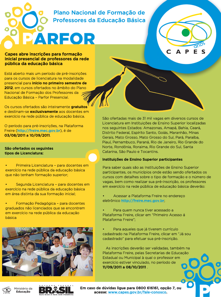 Está aberto mais um período de pré-inscrições para os cursos de Licenciatura na modalidade presencial para início no primeiro semestre de 2012, em cursos ofertados no âmbito do Plano Nacional de Formação dos Professores da Educação Básica – PARFOR Presencial. Os cursos ofertados são inteiramente gratuitos e destinam-se exclusivamente aos docentes em exercício na rede pública de educação básica. O período para pré-inscrições, na Plataforma Freire , vai até 10 de setembro. Confira as informações :