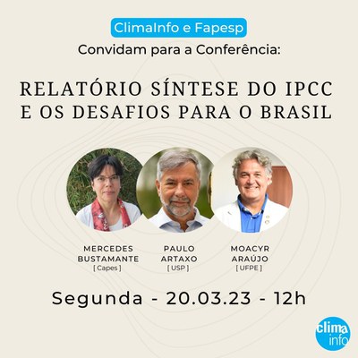 Mercedes Bustamante, presidente da CAPES, participará nesta segunda-feira (20), às 12h, da coletiva sobre o Relatório de Síntese do Painel Intergovernamental sobre Mudanças Climáticas (IPCC). A entrevista, que será apresentada pela plataforma ZOOM, avalia o encerramento do Sexto Ciclo de Avaliações do IPCC e é realizada pelo Instituto ClimaInfo, em parceria com o Programa de Mudanças Climáticas da Fundação de Amparo à Pesquisa de São Paulo (Fapesp).