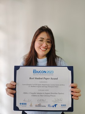 olsista Laura Quevedo Jurgina segurando o certificado IEEE EDUCON