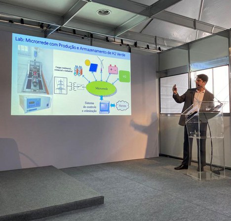 Professor Marcus Americano em apresentação do projeto atual do Instituto Nacional de Ciência e Tecnologia em Controle e Automação de Processos de Energia (INCTCAPE): Microrrede com Produção e Armazenamento de Hidrogênio Verde