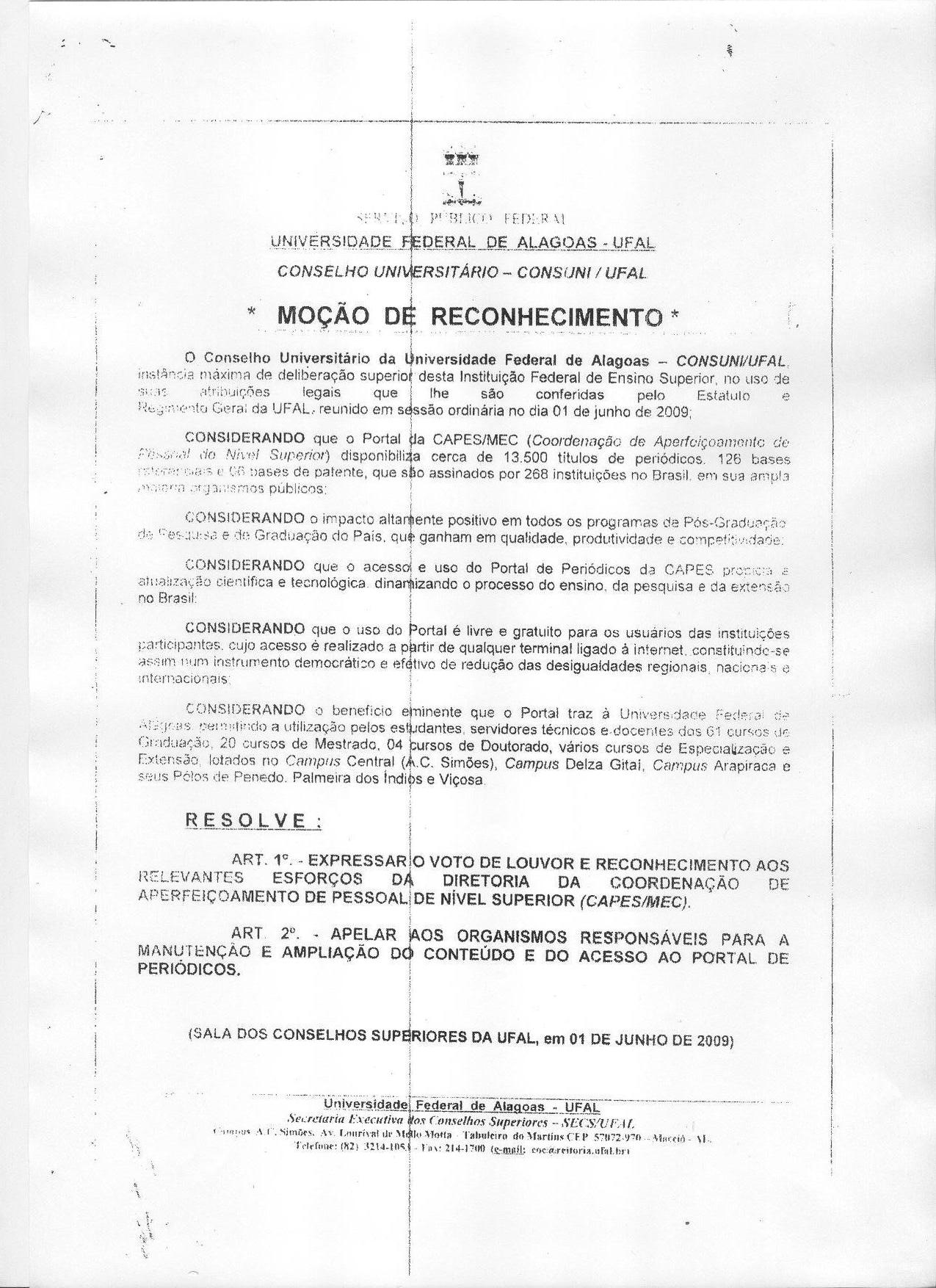O Conselho Universitário da Universidade Federal de Alagoas (UFAL) manifestou, em sessão ordinária realizada em junho, o reconhecimento da importância do Portal de Periódicos da Coordenação de Aperfeiçoamento de Pessoal de Nível Superior (Capes) na atualização científica e tecnológica.