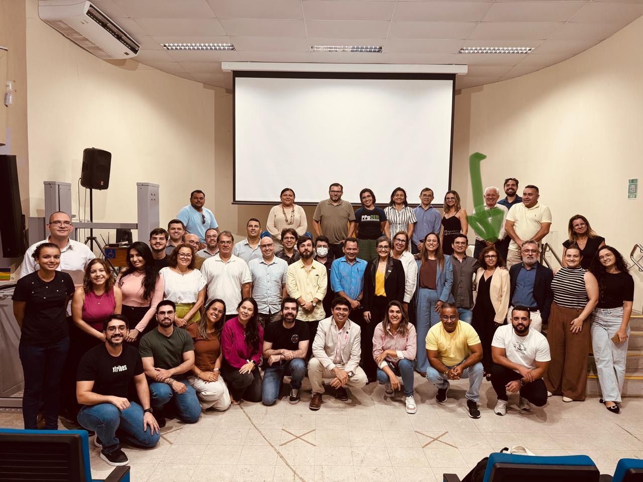 Imagem: Antonio Gomes de Souza Filho (agachado, de terno claro, ao centro) debateu a avaliação da pós-graduação com comunidade da Ufersa (Divulgação)