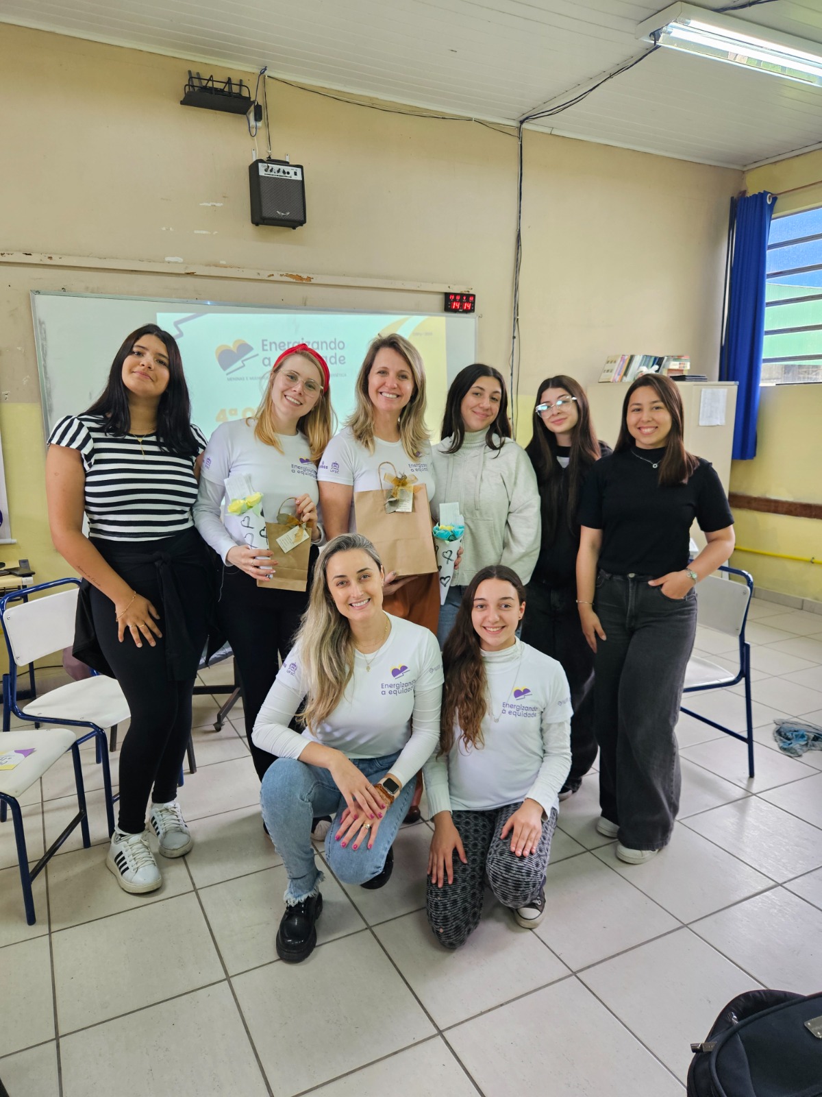 Imagem: A equipe da escola de Osório (RS); Liége Dalprá Flores e Luiza da Rosa Machado são as duas agachadas, à frente (Divulgação)