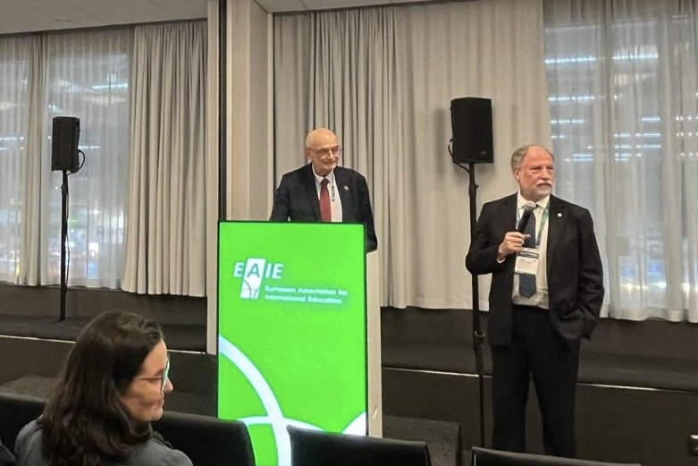 Imagem: Rui Oppermann e José Celso Freire Junior apresentaram o Programa CAPES Global.edu na EAIE 2025 (Divulgação)