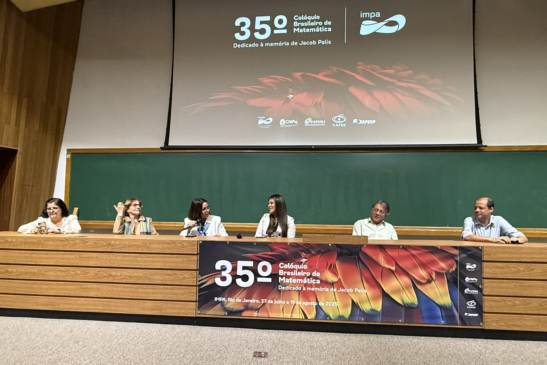 Imagem: Cerimônia da SBM reuniu CAPES, ABC, IMPA, direção nacional do ProfMat e a própria SBM (Divulgação/IMPA)